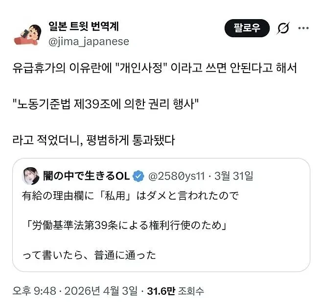 작성자NoelLiam.g 작성시간 26.04.09 산업체 회사 나보고 연차 좀 써 이래서, 다음날에 다음주에 연차 쓰겠다고하니깐