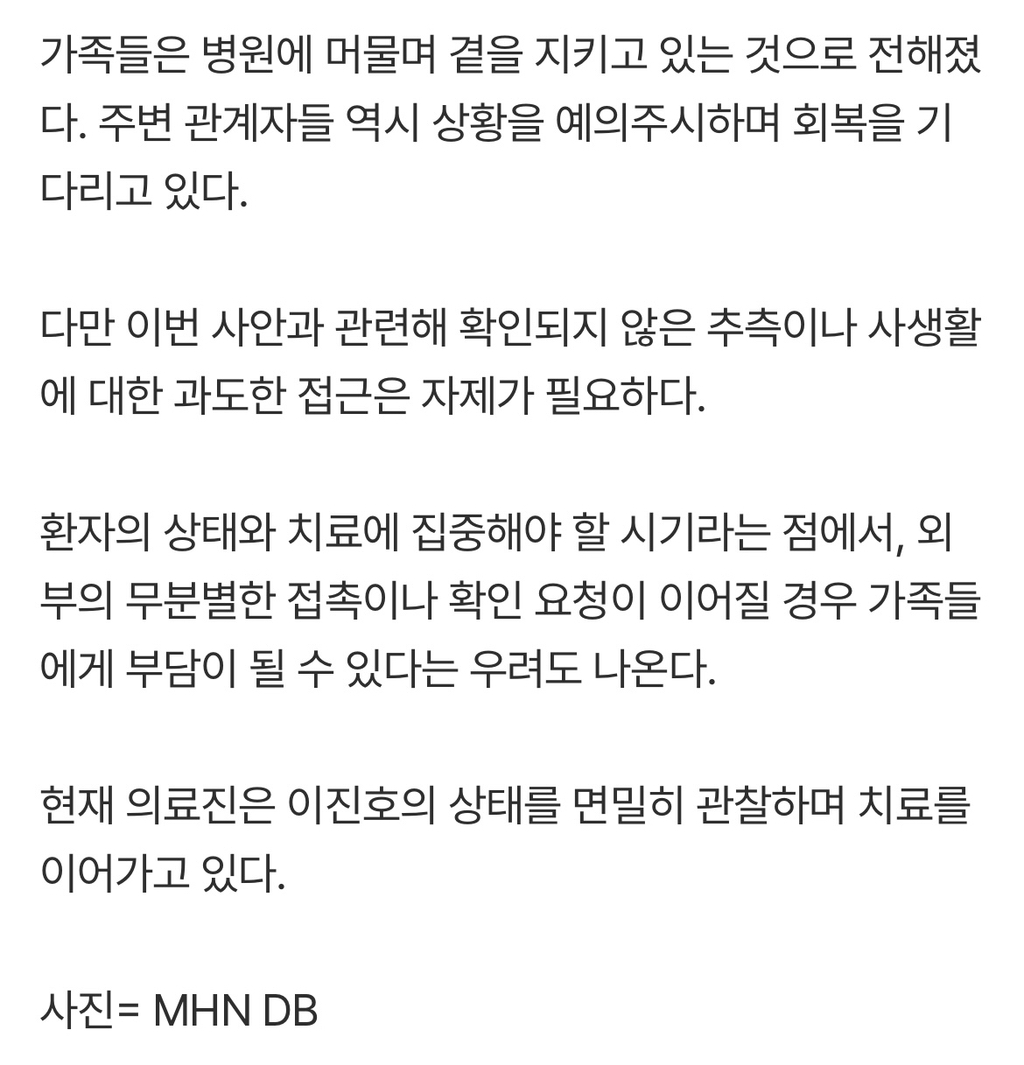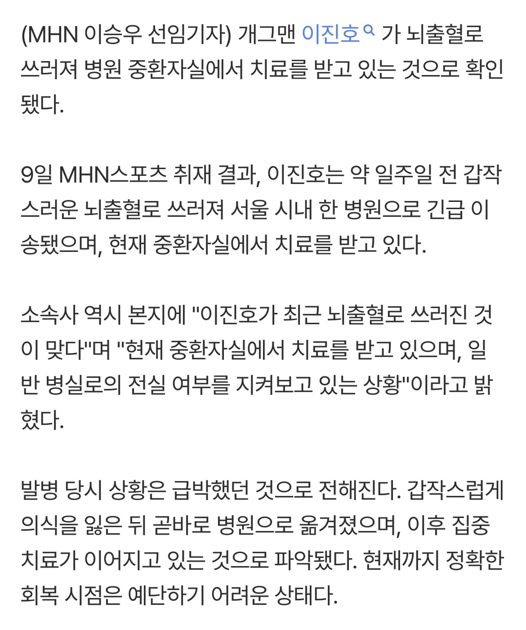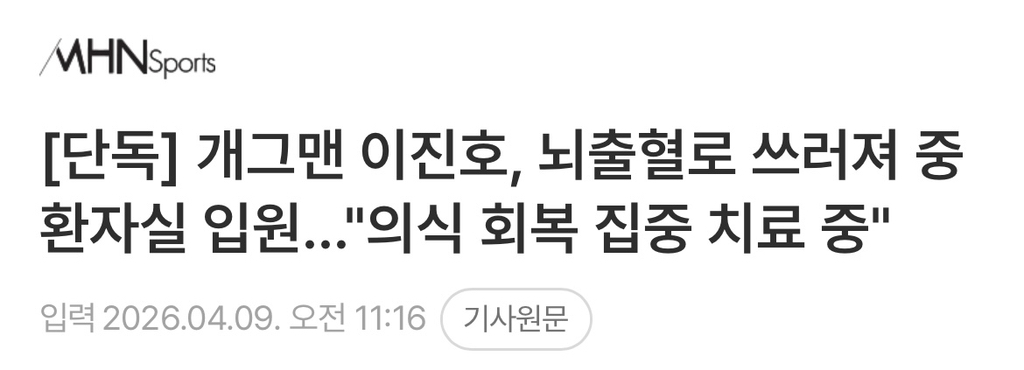 [단독] 개그맨 이진호, 뇌출혈로 쓰러져 중환자실 입원…"의식 회복 집중 치료 중" 작성자개멍이|작성시간26.04.09|조회수5,760 목록 댓글 17 글자크기 작게가 글자크기 크게가 https://m.entertain.naver.com/home/article/445/0000399348[단독] 개그맨 이진호, 뇌출혈로 쓰러져 중환자실 입원…"의식 회복 집중 치료 중"여기를 눌러 링크를 확인하세요m.entertain.naver.com 다음검색 현재 게시글 추가 기능 열기 북마크 공유하기 신고 센터로 신고 댓글 댓글 17 댓글쓰기 답글쓰기 댓글 리스트 작성자hasta otro días | 작성시간 26.04.09 죽은 여자친구만 불쌍 작성자포이리에르 | 작성시간 26.04.09 또 베팅 반대로 한겨? 작성자창크나이트 | 작성시간 26.04.09 돈 빌려준 사람들만 안됐지 작성자도탁스럽다 | 작성시간 26.04.09 언넝 쾌차하셔서 빚이나 갚으세요 작성자착호갑사 | 작성시간 26.04.09 빚은 갚아야지 진호야 댓글 전체보기