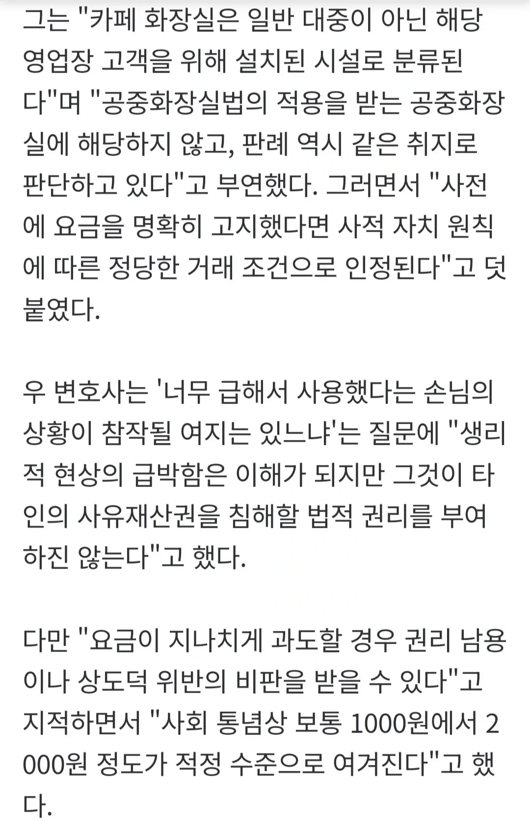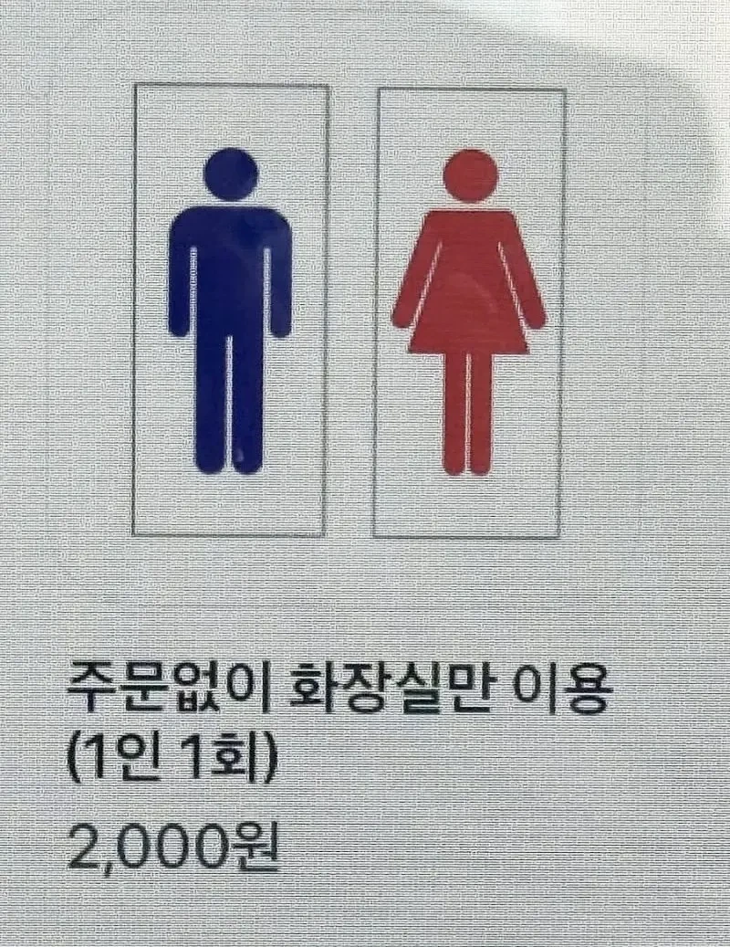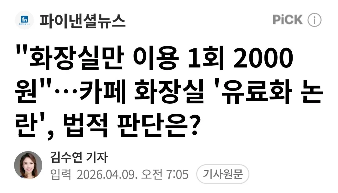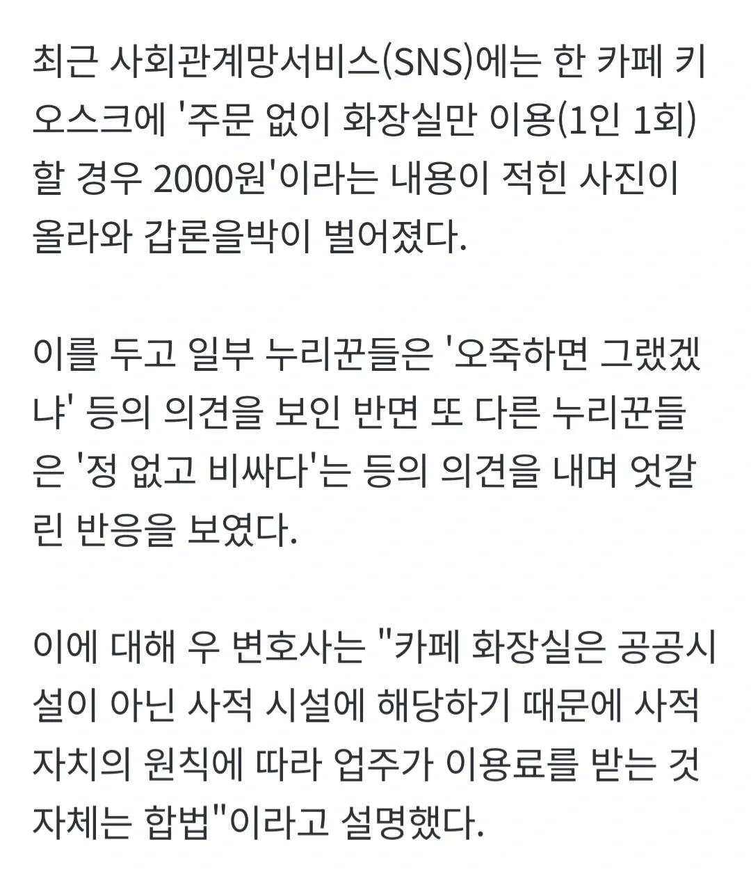 [스크랩] "화장실만 이용 1회 2000원"…카페 화장실 '유료화 논란', 법적 판단은? 작성자미쓰에이핑크|작성시간26.04.09|조회수2,544 목록 댓글 18 글자크기 작게가 글자크기 크게가 "화장실만 이용 1회 2000원"…카페 화장실 '유료화 논란', 법적 판단은?"화장실만 이용 1회 2000원"…카페 화장실 '유료화 논란', 법적 판단은?카페에서 업주가 '화장실 이용료'를 받는 건 법적으로 문제가 없을까. 지난 7일 YTN 라디오 '이원화 변호사의 사건 X파일'에는 우지형 변호사가 출연해 카페 키오스크에 등록된 '화장실 이용권'을 n.news.naver.com 다음검색 스크랩 원문 : 樂soccer 현재 게시글 추가 기능 열기 북마크 공유하기 신고 센터로 신고 댓글 댓글 18 댓글쓰기 답글쓰기 댓글 리스트 답댓글 작성자미르별 | 작성시간 26.04.10 ㄹㅇ 예전에는 이런 종류의 예의 같은 게 더 있었던 것 같은데 작성자미사리백수 | 작성시간 26.04.09 진짜 급하면 카드 맡기면서 이따 주문할테니 살려주세요. 하면 될듯 작성자트리플패티버거 | 작성시간 26.04.09 근처에 스벅 없으면 돈내고라도 가야지ㅋㅋㅋ 작성자oak tree | 작성시간 26.04.09 개방화장실 이용해야지 내기 싫으면 작성자으니유니아리 | 작성시간 26.04.09 그냥 아아하나 시키고 갔다오면 될듯 댓글 전체보기