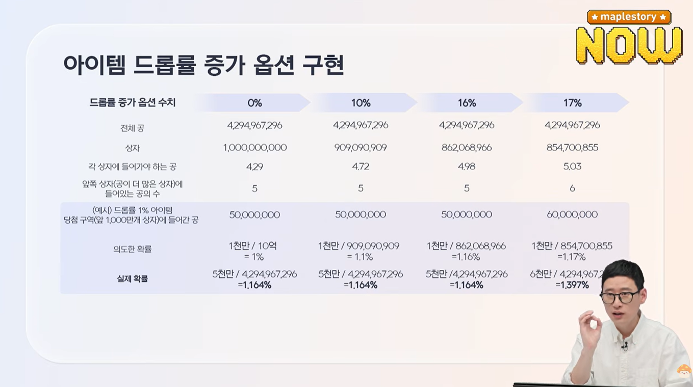 어떤 아이템을 드롭할때 드롭여부를 숫자를 1~42.9억사이에서 뽑고 그 숫자가 10억으로 줄인 확률 범위내에 있으면 드롭된다는 구조.