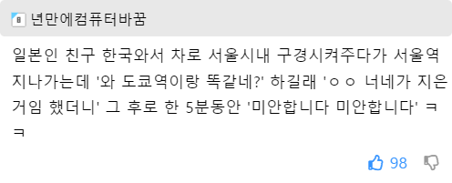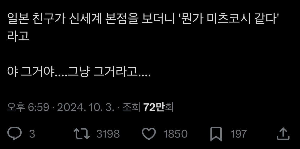 일본인: 신세계 백화점 왤케 미츠코시 같이 생김? ㅋㅋ 작성자맏쎄이의 제기라루_나이챠|작성시간26.04.09|조회수4,186 목록 댓글 5 글자크기 작게가 글자크기 크게가 일제강점기시절 미츠코시 경성점 건물을 적산 불하받아 지금까지 운영중인 것이 신세계백화점 본점. 그것이 그것이니까 다음검색 현재 게시글 추가 기능 열기 북마크 공유하기 신고 센터로 신고 댓글 댓글 5 댓글쓰기 답글쓰기 댓글 리스트 작성자빨간지붕 | 작성시간 26.04.09 ㅋㅌㅌㅌㅌㅋㅋㅋ너네가지은거임 작성자노오오오오오력 | 작성시간 26.04.09 맞으니까 작성자쥐돌이의하루 | 작성시간 26.04.09 그거라고.. 작성자DreaM | 작성시간 26.04.09 ㄱ- 작성자흠냐륑.... | 작성시간 26.04.09 수능 문학풀때 이상의 날개보면 각주로 달려있어서 알았음 ㅋㅋㅋㅋㅋ 댓글 전체보기