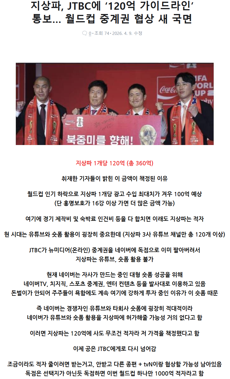 지상파 3사가 JTBC에 제시한 최종 월드컵 중계권료.JPG 작성자아스트라|작성시간26.04.09|조회수5,458 목록 댓글 17 글자크기 작게가 글자크기 크게가 출처 인벤 다음검색 현재 게시글 추가 기능 열기 북마크 공유하기 신고 센터로 신고 댓글 댓글 17 댓글쓰기 답글쓰기 댓글 리스트 작성자몰디브스쿠버맨 | 작성시간 26.04.09 관심도없다 작성자네코 유키치 | 작성시간 26.04.09 네이버 숏폼 많이들 보나? 작성자thefiveoceans | 작성시간 26.04.09 느낌상 저거 안받고 종편이랑해서 갈거같음 작성자옥탑방망고 | 작성시간 26.04.09 네이버가 씹오바네 작성자라즈그리즈 | 작성시간 26.04.10 치지직으로 보는거 너무좋고 댓글 전체보기
