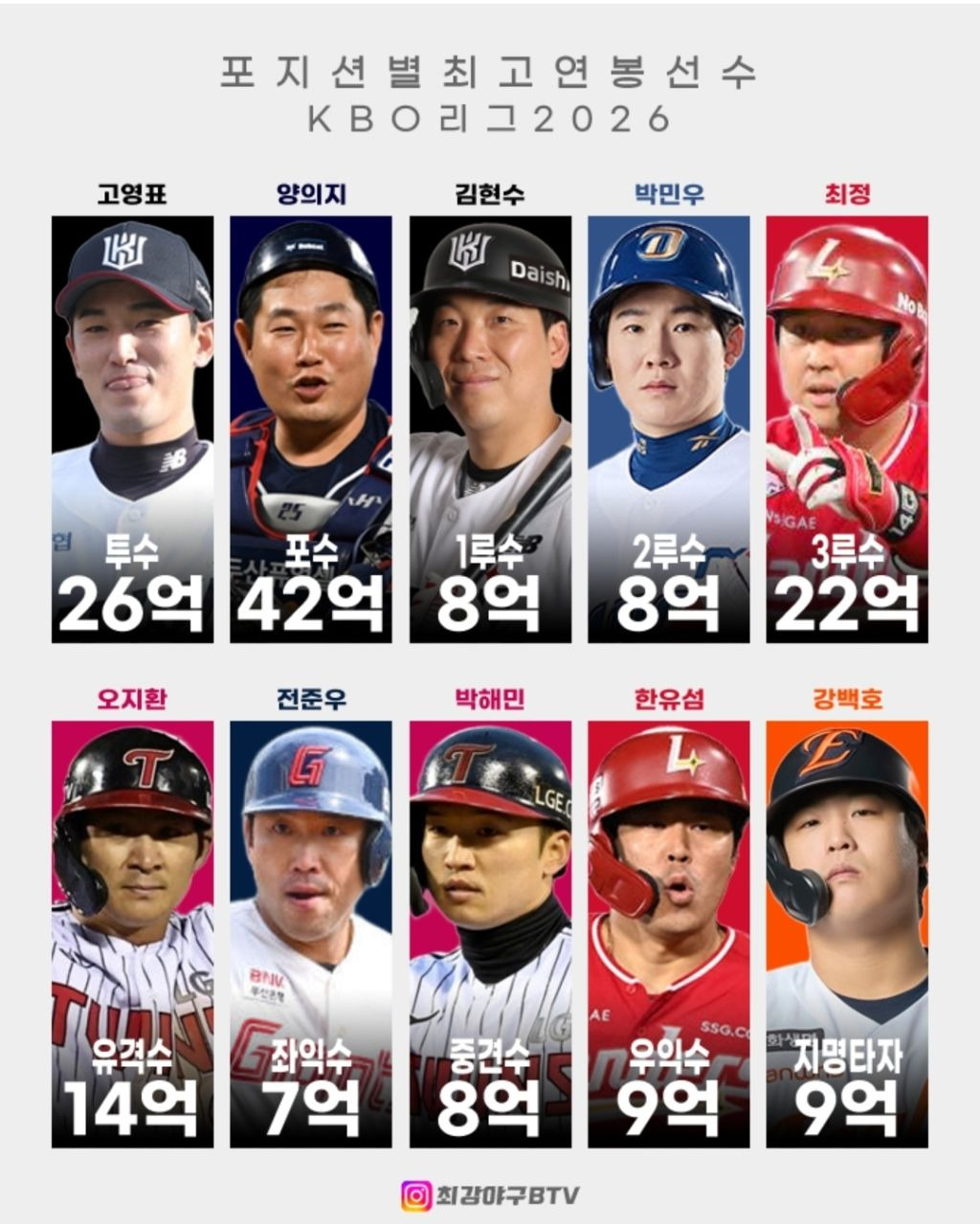 2026년 KBO 포지션별 최고 연봉 선수.JPG 작성자아스트라|작성시간26.04.09|조회수7,961 목록 댓글 8 글자크기 작게가 글자크기 크게가 출처 인벤 다음검색 현재 게시글 추가 기능 열기 북마크 공유하기 신고 센터로 신고 댓글 댓글 8 댓글쓰기 답글쓰기 댓글 리스트 작성자Shopper | 작성시간 26.04.09 좌익이 주누햄이라고???근데 크보는 계약금포함시켜야되는거아닌가싶긴한데 ㅋㅋ 작성자Bobtobob | 작성시간 26.04.09 유섬씨.. 작성자맬뱅 | 작성시간 26.04.09 섬유형? 작성자GEN.G Chovy | 작성시간 26.04.09 의지햄 한경기에 얼마더라... 작성자덕호삼촌 | 작성시간 26.04.10 지배야 오래오래 활약해줘 댓글 전체보기