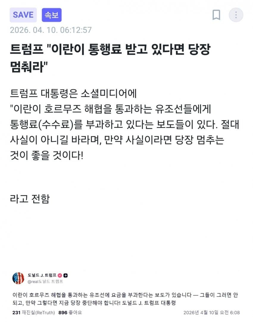 트럼프 : 이란 통행료 받지마 작성자내꿈은롯데우승보ㄱI|작성시간26.04.10|조회수5,350 목록 댓글 15 글자크기 작게가 글자크기 크게가 ??? 다음검색 현재 게시글 추가 기능 열기 북마크 공유하기 신고 센터로 신고 댓글 댓글 15 댓글쓰기 답글쓰기 댓글 리스트 작성자GanJ | 작성시간 26.04.10 제정신 아니네진짜 작성자파오후쿰척쿰척 | 작성시간 26.04.10 뭐래 ㅂㅅ쉐끼 작성자아이사 | 작성시간 26.04.10 나한테 내라고 작성자ㅇㄹㅈㄹ | 작성시간 26.04.10 혹시 나도 끼워줄수있는지 작성자내사랑둘리 | 작성시간 26.04.13 그걸 이제 알았다는 거여 뭐여 댓글 전체보기