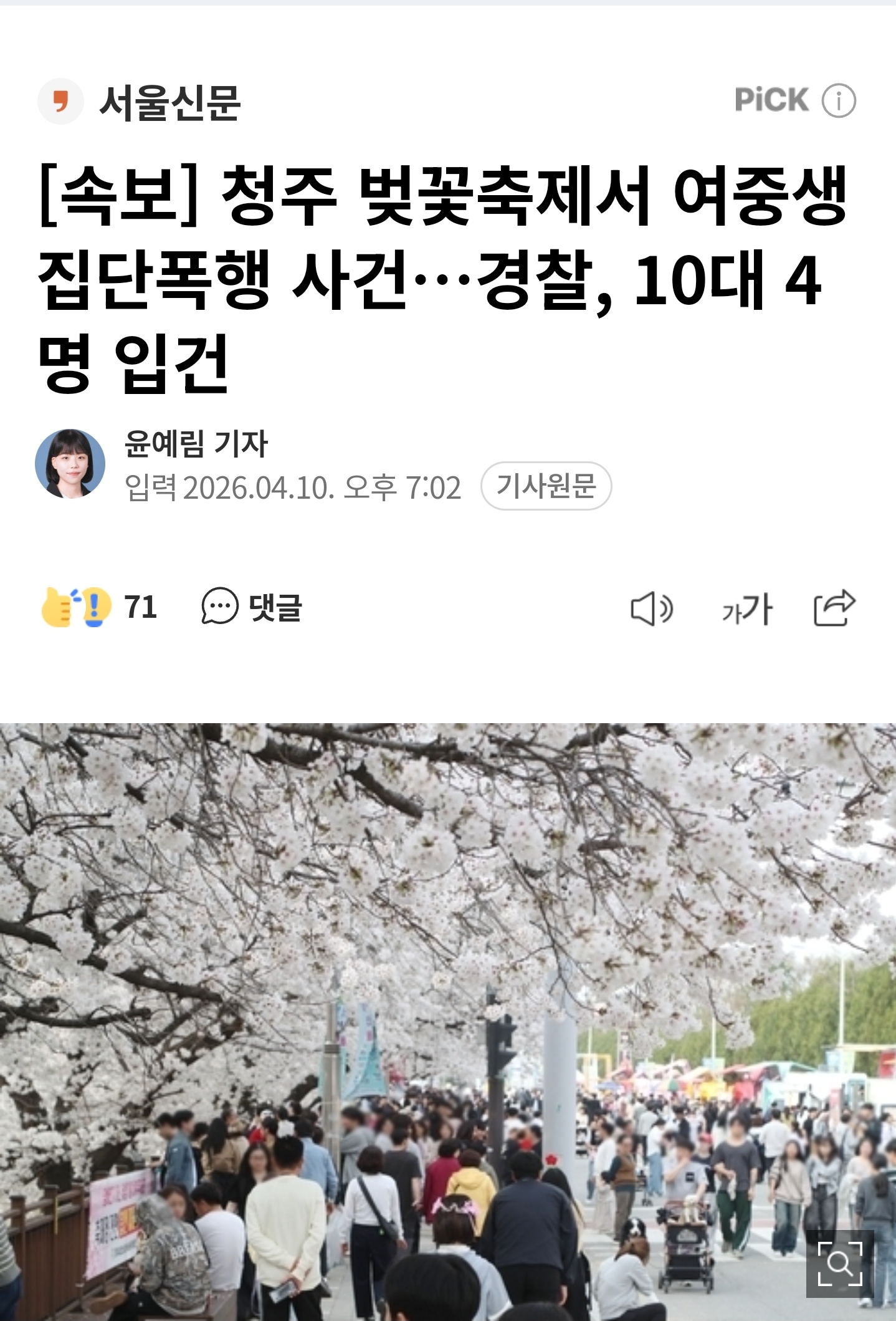 충북 청주에서 열린 벚꽃 축제 현장에서 또래 여중생을 집단 폭행한 10대들이 경찰에 붙잡혔다.