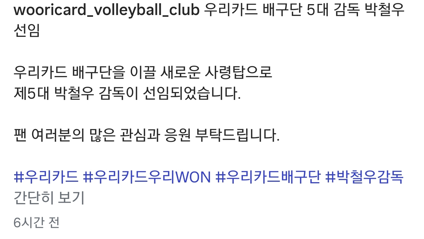 [스크랩] [[기타]][오피셜] 남자배구 서울 우리카드, 정식 감독으로 박철우 대행 선임! 작성자스타의일생|작성시간26.04.11|조회수2,210 목록 댓글 1 글자크기 작게가 글자크기 크게가 3년 계약이라고 합니다. 다음검색 스크랩 원문 : 樂soccer 현재 게시글 추가 기능 열기 북마크 공유하기 신고 센터로 신고 댓글 댓글 1 댓글쓰기 답글쓰기 댓글 리스트 작성자칼리스타 | 작성시간 26.04.11 잘하긴했지 내년에 기대되네 댓글 전체보기
