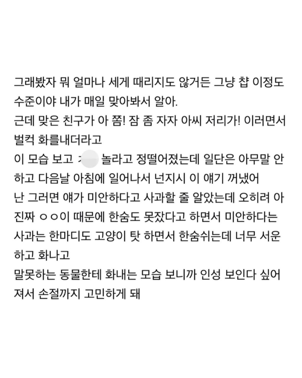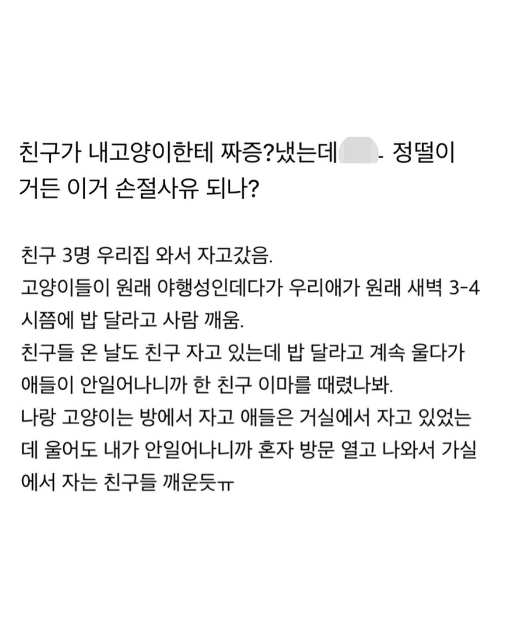 친구가 내 고양이한테 짜증냈는데 정떨이거든 작성자go yoon jeong|작성시간26.04.12|조회수11,321 목록 댓글 23 글자크기 작게가 글자크기 크게가 다음검색 현재 게시글 추가 기능 열기 북마크 공유하기 신고 센터로 신고 댓글 댓글 23 댓글쓰기 답글쓰기 댓글 리스트 작성자Hearts2Hearts | 작성시간 26.04.12 지는 지방에서 자고있었으면 한대만 때렸는지 계속 귀찮게 때렸는지 어찌안데 ㅋㅋ 작성자인류학자 | 작성시간 26.04.12 그냥 고양이랑 친구랑 둘이서 서로 사과하고 해결보는게 좋을거같은데 작성자돈버닝 | 작성시간 26.04.12 지가 쳐자느라 밥안줘서 친구딱밤맞게해놓고 뭔ㅋㅋㅋㅋㅋ 작성자RightLeftRight | 작성시간 26.04.13 ㅁㅊ 관리자에 의해 규제된 글입니다. 댓글 전체보기