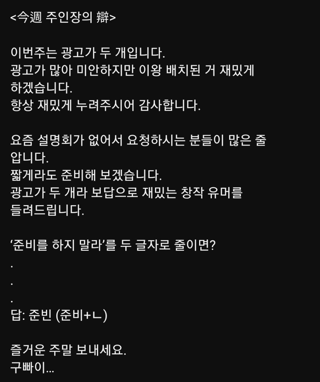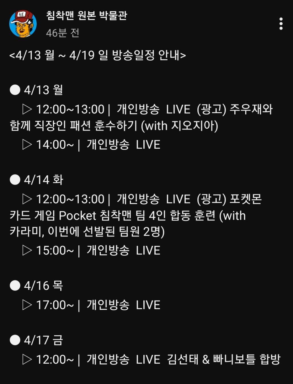 [[유튜브]]침착맨 다음주 방송일정공지 작성자마젠타|작성시간26.04.12|조회수17,585 목록 댓글 9 글자크기 작게가 글자크기 크게가 주우재에 김선태에 빠니보틀 ㄷㄷ알차네요 다음검색 현재 게시글 추가 기능 열기 북마크 공유하기 신고 센터로 신고 댓글 댓글 9 댓글쓰기 답글쓰기 댓글 리스트 작성자슘댱이 | 작성시간 26.04.12 금요일 꿀잼각 작성자알바아냐 | 작성시간 26.04.12 요즘 보면 허구언날 광고만있어서잘안보게되던대... 작성자반갑세피나 | 작성시간 26.04.12 라이브는 아니지만 15일에도 큰거온다 작성자오로르 | 작성시간 26.04.12 준빈 ㅋㅋㅋ 작성자끼링 | 작성시간 26.04.13 금요일 월루용으로 딱 좋겠다 ㅎㅎ 댓글 전체보기