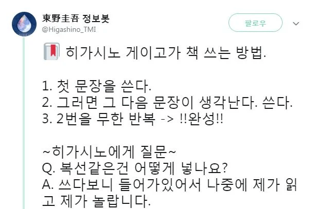 AI처럼 글을 쓰는 작가 작성자가담항설|작성시간26.04.14|조회수9,157 목록 댓글 4 글자크기 작게가 글자크기 크게가 다음검색 현재 게시글 추가 기능 열기 북마크 공유하기 신고 센터로 신고 댓글 댓글 4 댓글쓰기 답글쓰기 댓글 리스트 작성자작은새의꿈 | 작성시간 26.04.14 너무 신기네요 ㅎㅎ 작성자관람하는관람차 | 작성시간 26.04.14 이아저씨 작품 찍어내는 능력은 진짜 탑급임. 1년에 신간 몇개가 나오는지 모르겠음 ㅋㅋㅋㅋㅋ 작성자호밀밭의사기꾼 | 작성시간 26.04.14 솔직히 그래서 작품편차있음 작성자슬픈곰돌이 | 작성시간 26.04.14 외계인이 미래의 책을 전달해주는건가 댓글 전체보기