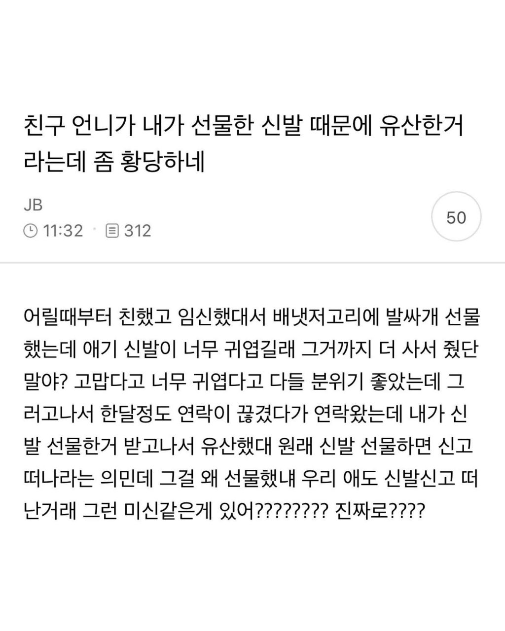 작성자된꾸앙 작성시간 26.04.15 병신같은생각이지 신발 선물받아서 유산됐겠냐..