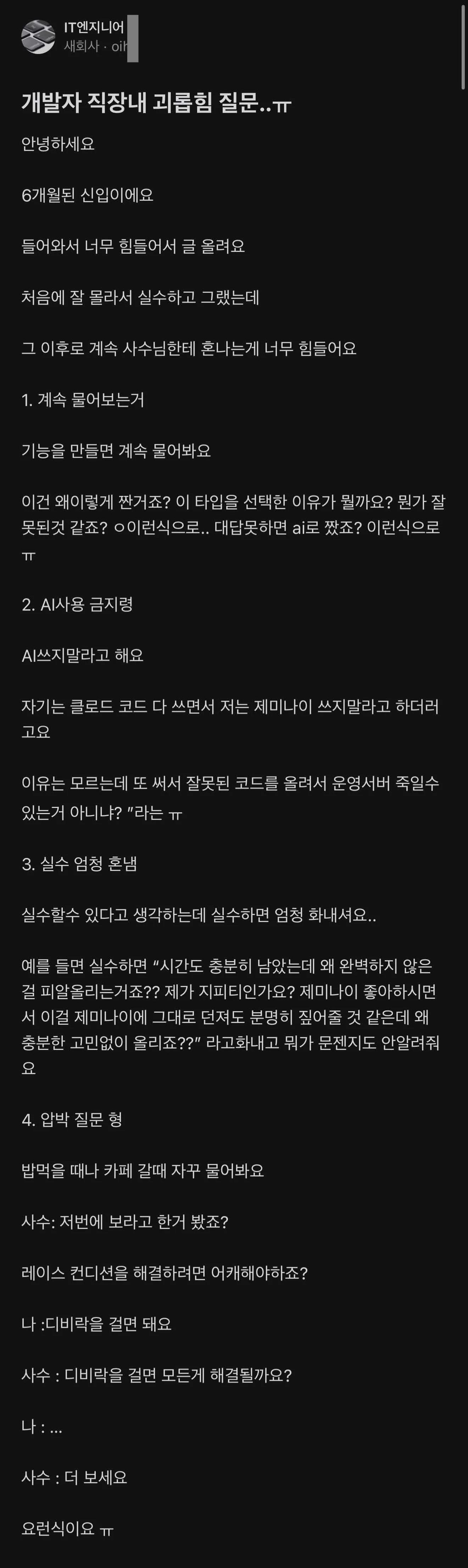 작성자알파코 작성시간 26.04.15 현직 PM인데 저는 저 신입을 이해할수도 있습니다. 개발자들은 감정이 없는 기계들이라 저도 대화하다가 상처받습니다.