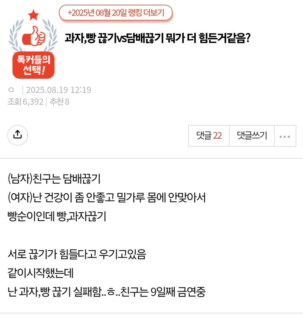 작성자도탁스가끔옴 작성시간 26.04.15 담배 안 하는 입장에서 금연 얼마나 어려운지는 모르겠지만 과자 빵 그까짓거 그냥 평생 안 먹을 수도 있을 듯