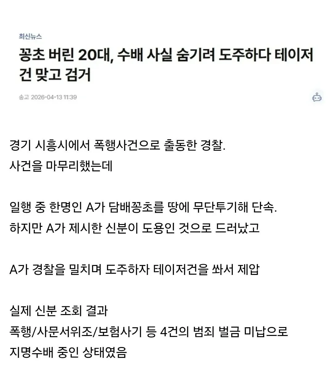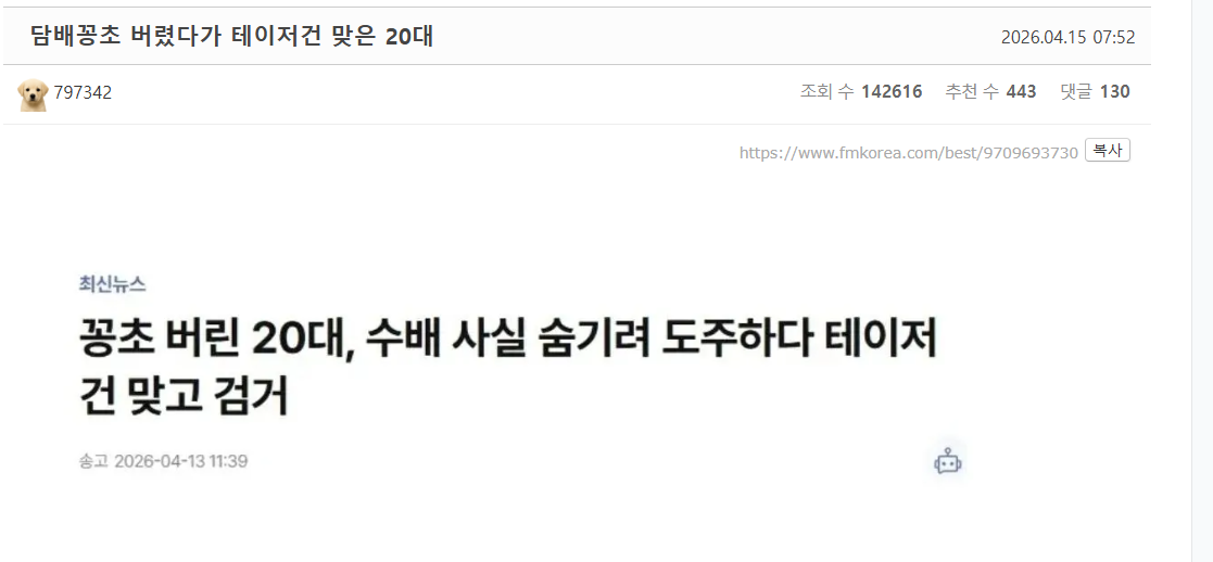 담배꽁초 버렸다가 테이저건 맞은 20대 작성자스키테일러s|작성시간26.04.15|조회수2,317 목록 댓글 4 글자크기 작게가 글자크기 크게가 ㅋㅋㅋㅋㅋㅋㅋㅋㅋㅋ 다른것보다 흡연충은 ㅋㅋ 담배피고 그냥 땅바닥에 버리는걸 경찰앞에서 대놓고하넼ㅋㅋㅋㅋㅋㅋㅋㅋㅋ 다음검색 현재 게시글 추가 기능 열기 북마크 공유하기 신고 센터로 신고 댓글 댓글 4 댓글쓰기 답글쓰기 댓글 리스트 작성자슈퍼갤럭시비누 | 작성시간 26.04.15 븅신이네 진짜 ㅋㅋ 작성자돈버닝 | 작성시간 26.04.15 흡평ㅋㅋㅋㅋ 작성자잡아스프링 | 작성시간 26.04.15 게다가 수배중이네? 맞아야겠지? 작성자미르별 | 작성시간 26.04.16 진짜 상븅신이네 ㅋㅋㅋ 댓글 전체보기