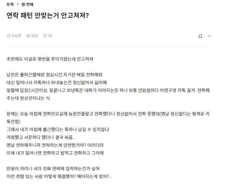 연락 패턴 안 맞는거 안 고쳐져? 작성자Miyeon|작성시간26.04.15|조회수1,862 목록 댓글 8 글자크기 작게가 글자크기 크게가 다음검색 현재 게시글 추가 기능 열기 북마크 공유하기 신고 센터로 신고 댓글 댓글 8 댓글쓰기 답글쓰기 댓글 리스트 작성자락싸에서 넘어옴 | 작성시간 26.04.15 잘못이 아닌데 '고친다' 하고 하는거부터 글러먹음. 서로 '맞춘다' 라고 해야지 작성자lljoo | 작성시간 26.04.15 진짜싫다 작성자마들렘 | 작성시간 26.04.15 맞는 사람 만나야지 뭐 작성자흔들우 | 작성시간 26.04.15 지가 정답이라는게 깔려있는데 잘도 해주고싶겠다 작성자이자하 | 작성시간 26.04.15 안 맞으면 헤어져라니 생각이 세상의 정답이 아니다. 댓글 전체보기