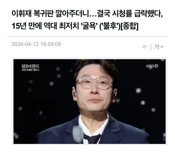 이휘재 출연편 불후의명곡 시청률 .jpg 작성자헤이즈 heize|작성시간26.04.15|조회수5,969 목록 댓글 31 글자크기 작게가 글자크기 크게가 다음검색 현재 게시글 추가 기능 열기 북마크 공유하기 신고 센터로 신고 댓글 댓글 31 댓글쓰기 답글쓰기 댓글 리스트 작성자송파구 | 작성시간 26.04.15 아무런 논란없이 오롯이 인성하나로... 작성자물과같은존재 | 작성시간 26.04.15 ㅋㅋㅋㅋㅋㅋㅋㅋㅋㅋㅋㅋㅋㅋㅋㅋㅋㅋㅋㅋㅋㅋㅋㅋ 작성자무장전선 | 작성시간 26.04.15 pd 감다뒤 작성자용녀의몸부림 | 작성시간 26.04.15 꽂아준거 시말서쓰려나 ㅋㅋㅋㅋ 작성자작은새의꿈 | 작성시간 26.04.15 이거 사실 아니란 글 있던데 한번 확인해 봐야 될 것같아요 댓글 전체보기