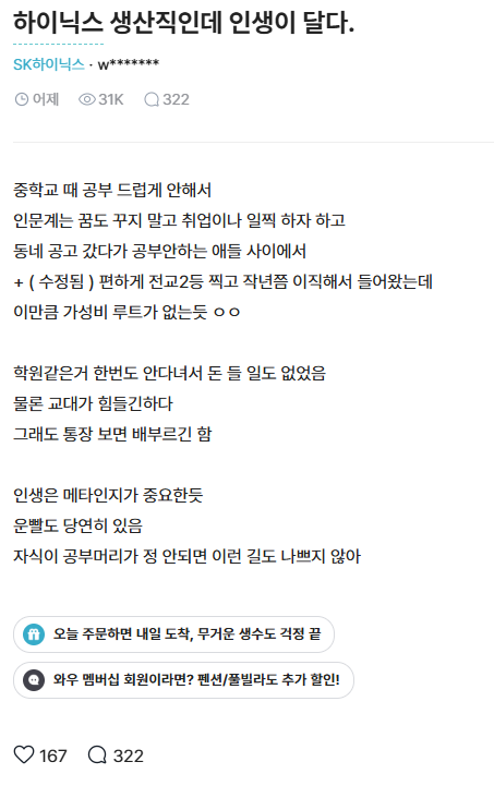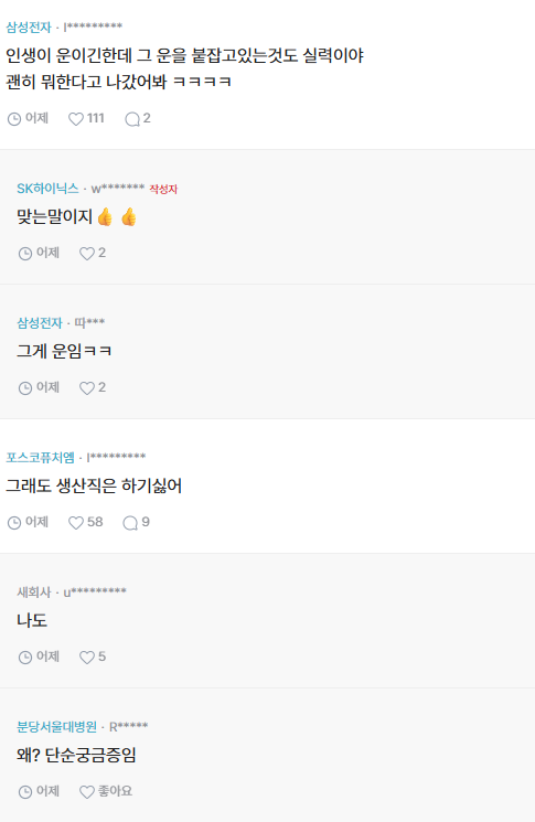 작성자킬링미 작성시간 26.04.15 그회사에 다니지 못했다면 주식으로!! ㅋㅋ 현실은 디아블로2 파밍 비슷해서 죙일 노력해도 모두 헛수고일수도, 그래도 기본시급까지는 누구나 노력가능하니깐 뭐..인간이 뇌기능 외모 이런거에 엄청 영향 받는데 그거 다 운으로 나옴