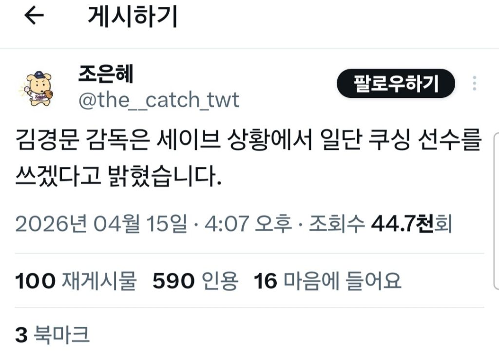 [KBO] 선발용투를 마무리로 쓰겠다는 한화 감독ㄷㄷㄷㄷㄷ 작성자우주소녀보나|작성시간26.04.15|조회수2,498 목록 댓글 10 글자크기 작게가 글자크기 크게가 레전드 갱신 중 다음검색 현재 게시글 추가 기능 열기 북마크 공유하기 신고 센터로 신고 댓글 댓글 10 댓글쓰기 답글쓰기 댓글 리스트 작성자앵무살수 | 작성시간 26.04.15 ㅋㅋㅋㅋ 역겨운행보 작성자김스멜 | 작성시간 26.04.15 날마다 레전드 ㅋㅋㅋ 작성자관람하는관람차 | 작성시간 26.04.15 그거 예전에 김기태감독이 리즈 마무리로 하다가 2경기만에 바꾼 사례가 있는데 ㅎㅎ 작성자기합으로버텨 | 작성시간 26.04.15 가진 능력에 비해 외인 복이 수상하게 좋았던 감독 작성자미츠 아마이 | 작성시간 26.04.15 올해는 야구 안 봐야지.. ㅡㅡ 댓글 전체보기