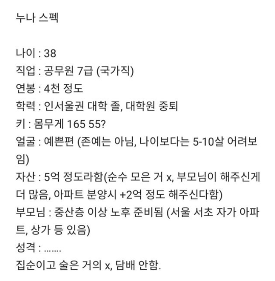 [[기타]]우리누나 현실에 결혼할 수 있을까요? 작성자가면라이더 3|작성시간26.04.15|조회수4,803 목록 댓글 37 글자크기 작게가 글자크기 크게가 ㅊㅊ 블라인드 다음검색 현재 게시글 추가 기능 열기 북마크 공유하기 신고 센터로 신고 댓글 댓글 37 댓글쓰기 답글쓰기 댓글 리스트 작성자려름 | 작성시간 26.04.15 충분히함ㅋㅋㅋㅋ친척누나 47에 굘혼ㅋㅋ 작성자제르딘 | 작성시간 26.04.15 ㄷㄷ 같은조건에 남자면 99프로 연하 만날듯 작성자산골짜기 | 작성시간 26.04.15 나이땜에 진짜 절대안될듯... 운이 개좋은거 아님 힘듬 ㅠㅠ 작성자2BPeterPan | 작성시간 26.04.15 저조건도 안되지만 나라도 안함 ㅋㅋㅋ 작성자미사리백수 | 작성시간 26.04.16 나이 연상으로 6살정도면 가능할듯 댓글 전체보기