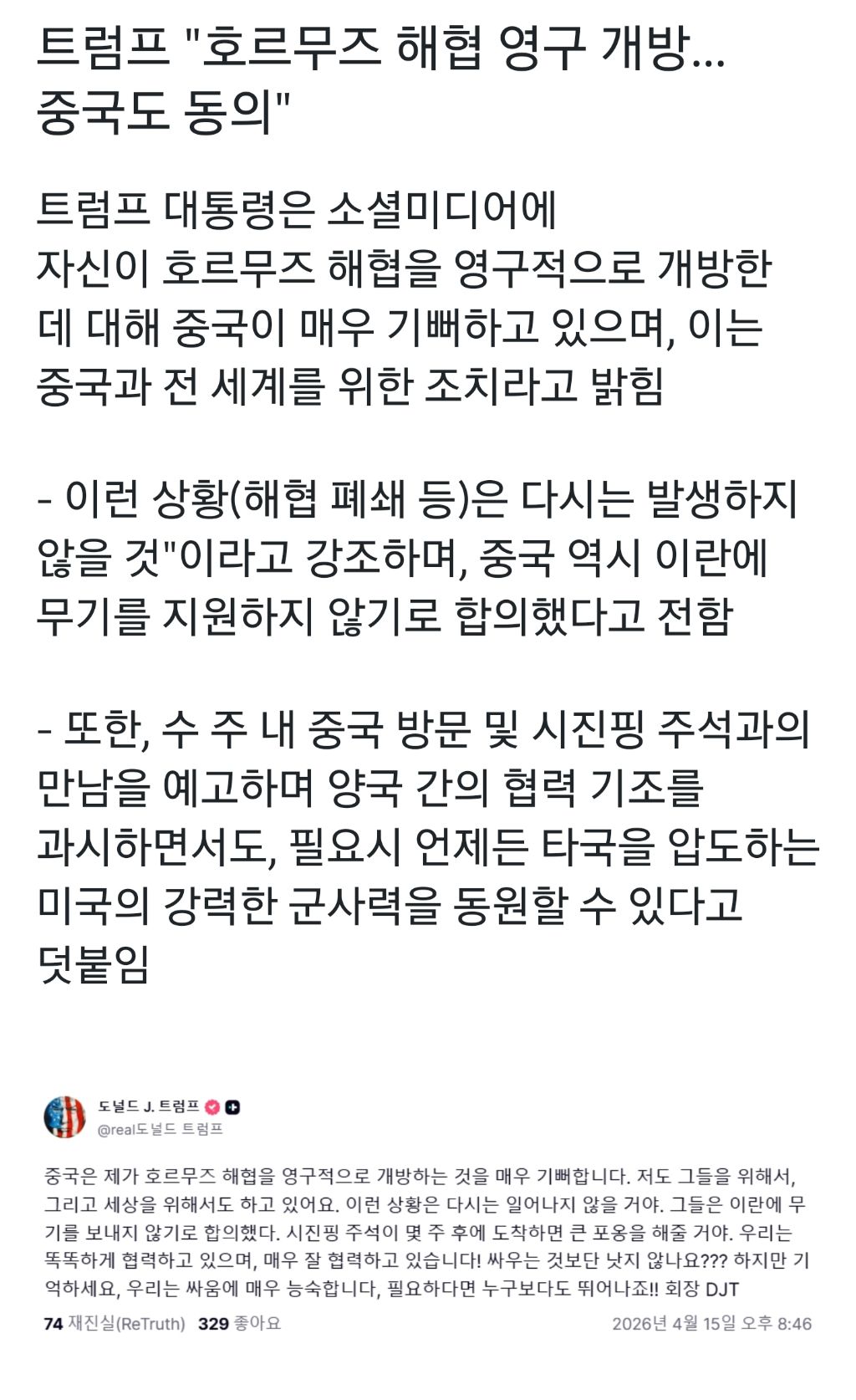 트럼프 "호르무즈 해협 영구 개방.. 중국도 동의' 작성자밍글스|작성시간26.04.15|조회수4,936 목록 댓글 20 글자크기 작게가 글자크기 크게가 다음검색 현재 게시글 추가 기능 열기 북마크 공유하기 신고 센터로 신고 댓글 댓글 20 댓글쓰기 답글쓰기 댓글 리스트 작성자천민에서 왕이되는 스토리 | 작성시간 26.04.15 이란한테 져놓고 정신승리는 진짜 ㅋㅋㅋㅋ 작성자다현 | 작성시간 26.04.15 미국이 열어도 이란이 닫으면 노답 아님? 작성자댕댕잉 | 작성시간 26.04.15 트럼프 중국 밑임? ㅋㅋ 답댓글 작성자대항3재밌네 | 작성시간 26.04.15 ㅇㅇ 하는거보면 둘이 영혼의 듀오임. 작성자금욕중 | 작성시간 26.04.15 요즘은 진짜 짱개보다 더한새끼란걸 체감중 댓글 전체보기