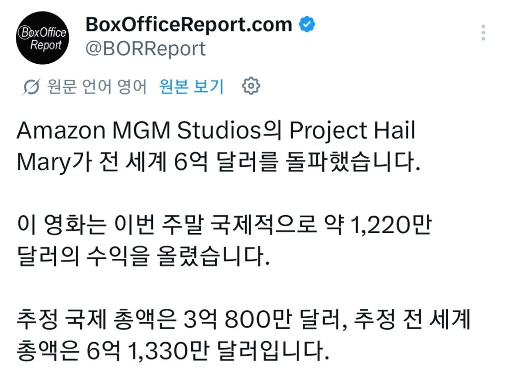 북미 흥행으론 <마션> <인터스텔라>을 넘었음
