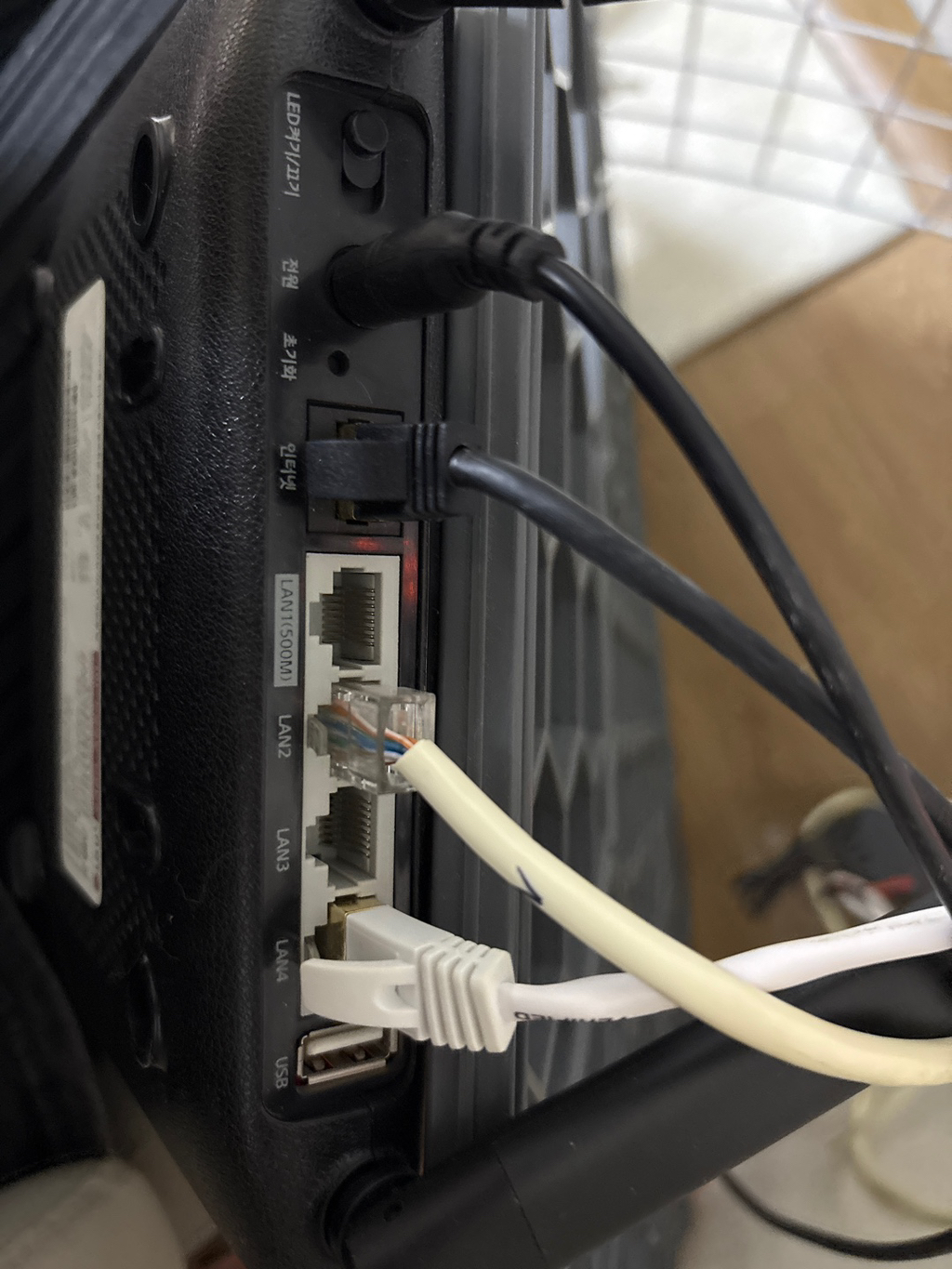 사진에 v표시된 랜선이 외부에서 끌어온 랜선이구 인터넷 포트랑 데스크탑이랑 연결해서 사용중이였던거 같아요