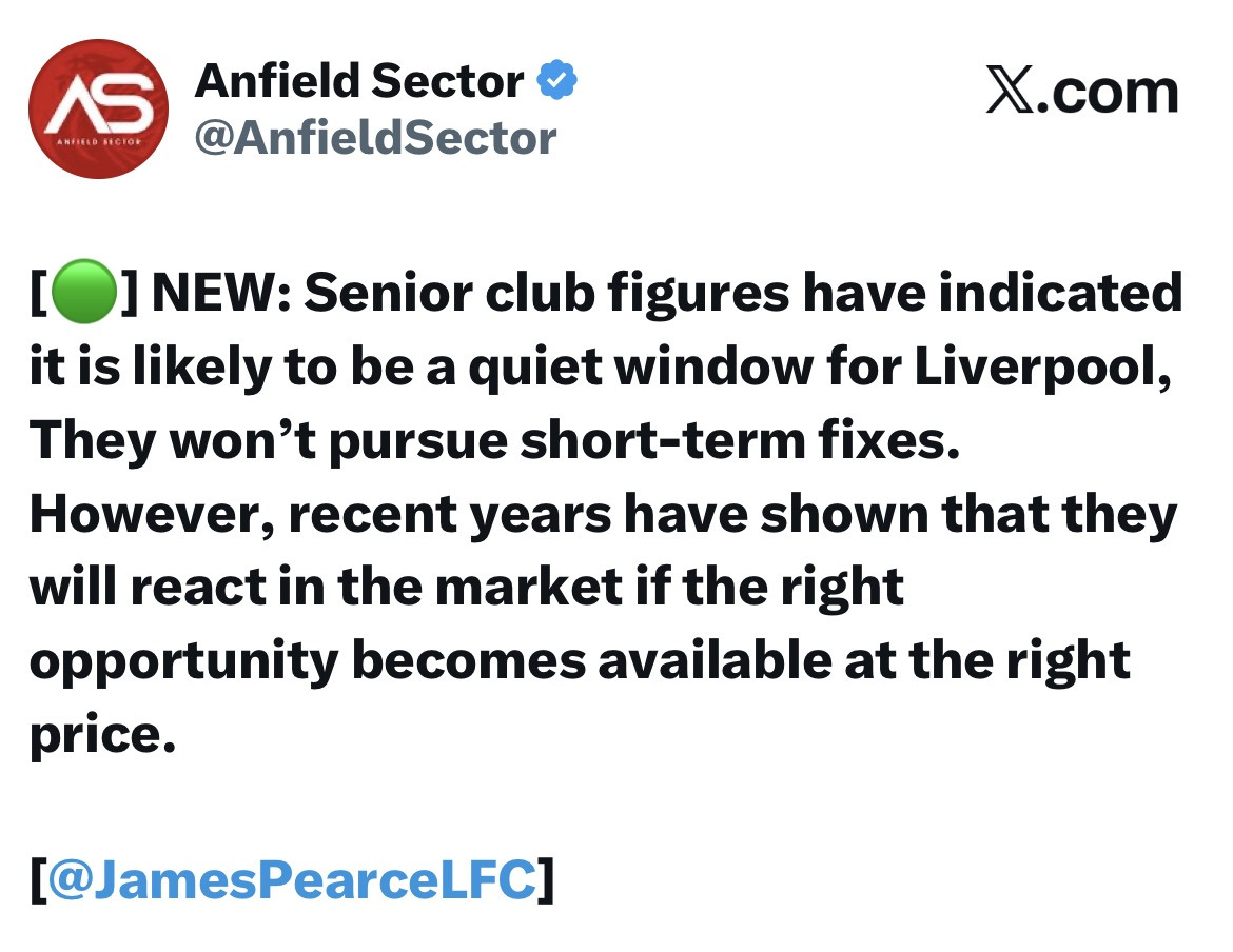 리버풀의 구단 고위 관계자들은 이번 이적 시장이 조용하게 흘러갈 가능성이 높다고 시사함. 그들은 단기적인 해결책(땜질식 영입)을 추진하지 않을 것.
