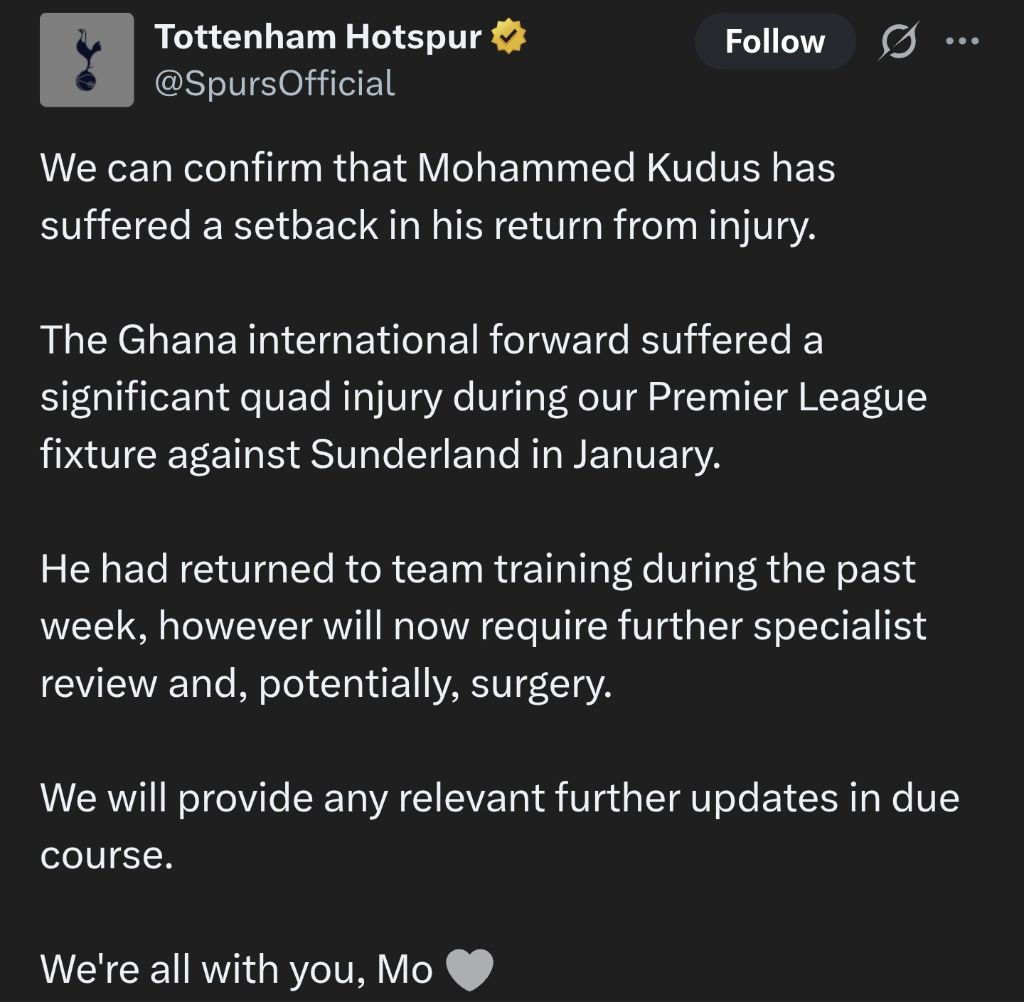 토트넘초비상 작성자죽순테타mk.3|작성시간26.04.10|조회수716 목록 댓글 5 글자크기 작게가 글자크기 크게가 토트넘 : 쿠두스 팀훈련 복귀 했지만 수술 필요해보임 다음검색 현재 게시글 추가 기능 열기 북마크 공유하기 신고 센터로 신고 댓글 댓글 5 댓글쓰기 답글쓰기 댓글 리스트 작성자에이사 | 작성시간 26.04.10 개판이네 작성자우리셔 | 작성시간 26.04.10 클루셉도 아직 안돌아오는거 보면 저기 의료진이 별로인가.... 작성자아니야 아무리 힘들어도 이럴순 없어 | 작성시간 26.04.10 진짜 강등가나 작성자민정수석비서관 | 작성시간 26.04.10 ㄷㄷ그나마 믿을맨 아님? 진짜 비상인거 같은데 ㄷㄷ 작성자Reze 레제 | 작성시간 26.04.10 저런 팀에서 잘 안다친 손케는 뭘까... 댓글 전체보기