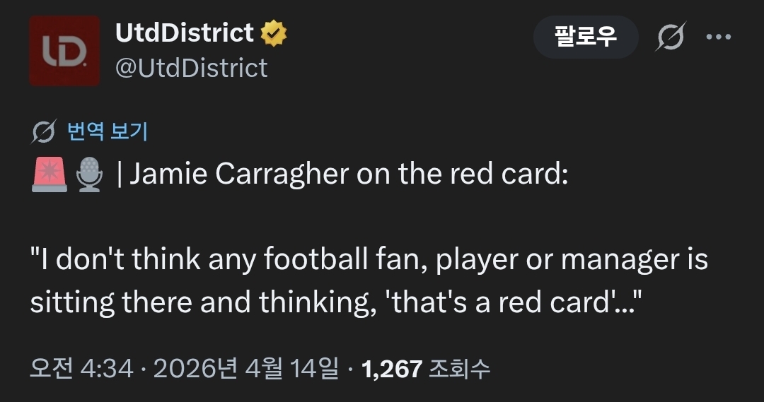 [스크랩] 캐러거: 어떤 축구팬들, 선수와 감독들도 그게 퇴장이라고 생각하지는 않을 것 작성자민정수석비서관|작성시간26.04.15|조회수301 목록 댓글 1 글자크기 작게가 글자크기 크게가 https://x.com/UtdDistrict/status/2043805024866783632?s=20X의 UtdDistrict님(@UtdDistrict)🚨🎙️ | Jamie Carragher on the red card: "I don't think any football fan, player or manager is sitting there and thinking, 'that's a red card'..."x.com 다음검색 스크랩 원문 : 맨체스터 유나이티드 현재 게시글 추가 기능 열기 북마크 공유하기 신고 센터로 신고 댓글 댓글 1 댓글쓰기 답글쓰기 댓글 리스트 작성자맵이어두우면안돼 | 작성시간 26.04.15 캐러거가 저리 말할정도면...ㅋㅋ 댓글 전체보기