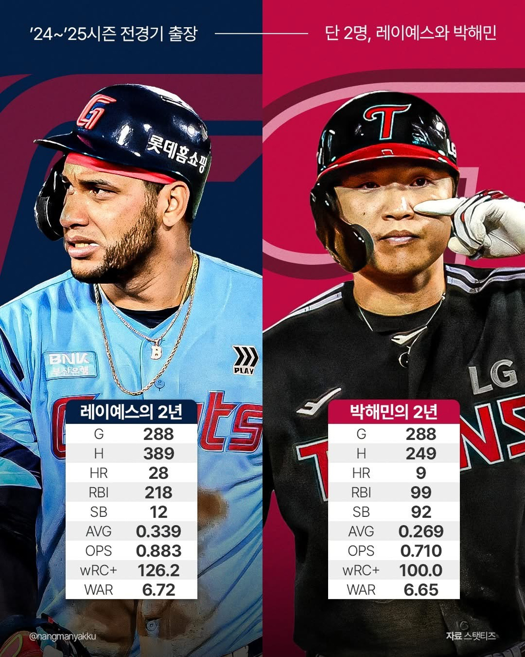 최근 2년 연속 풀타임 타자들 스탯 작성자내꿈은롯데우승보ㄱI|작성시간26.01.05|조회수595 목록 댓글 3 글자크기 작게가 글자크기 크게가 다음검색 현재 게시글 추가 기능 열기 북마크 공유하기 신고 센터로 신고 댓글 댓글 3 댓글쓰기 답글쓰기 댓글 리스트 작성자구래구래구래팸 | 작성시간 26.01.05 박해민 팬들이 바라는 센터라인 표본이네우르크 100 + 수비 최상급 + 철강왕 작성자변 검 | 작성시간 26.01.05 오른쪽사진박해민이아니라문보경인줄알았네 답댓글 작성자그리고나 | 작성시간 26.01.05 엌ㅋㅋㅋ 저도 ㅋㅋㅋㅋㅋ 문보경 쉬었는데? 했더니 박해민이었음 ㅋㅋㅋ 댓글 전체보기