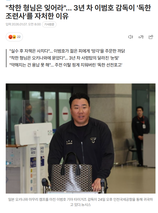 [KIA]형님리더십으로 우승했다고 놀았지만~~ 작성자설알문2|작성시간26.01.07|조회수450 목록 댓글 1 글자크기 작게가 글자크기 크게가 착한 형님은 잊어라~~전시즌 홈런왕한테 홈런 맞았다고 갈구면서~경기중에 선수 울릴정도로 갈구면서~함평 타이거즈로 2위까지 올려줬지만 부상 선수 공백이 크다고 징징거리면서~ 다음검색 현재 게시글 추가 기능 열기 북마크 공유하기 신고 센터로 신고 댓글 댓글 1 댓글쓰기 답글쓰기 댓글 리스트 작성자포메라니안. | 작성시간 26.01.07 착한형님 ㄷㄷ 이미지 확대 댓글 전체보기