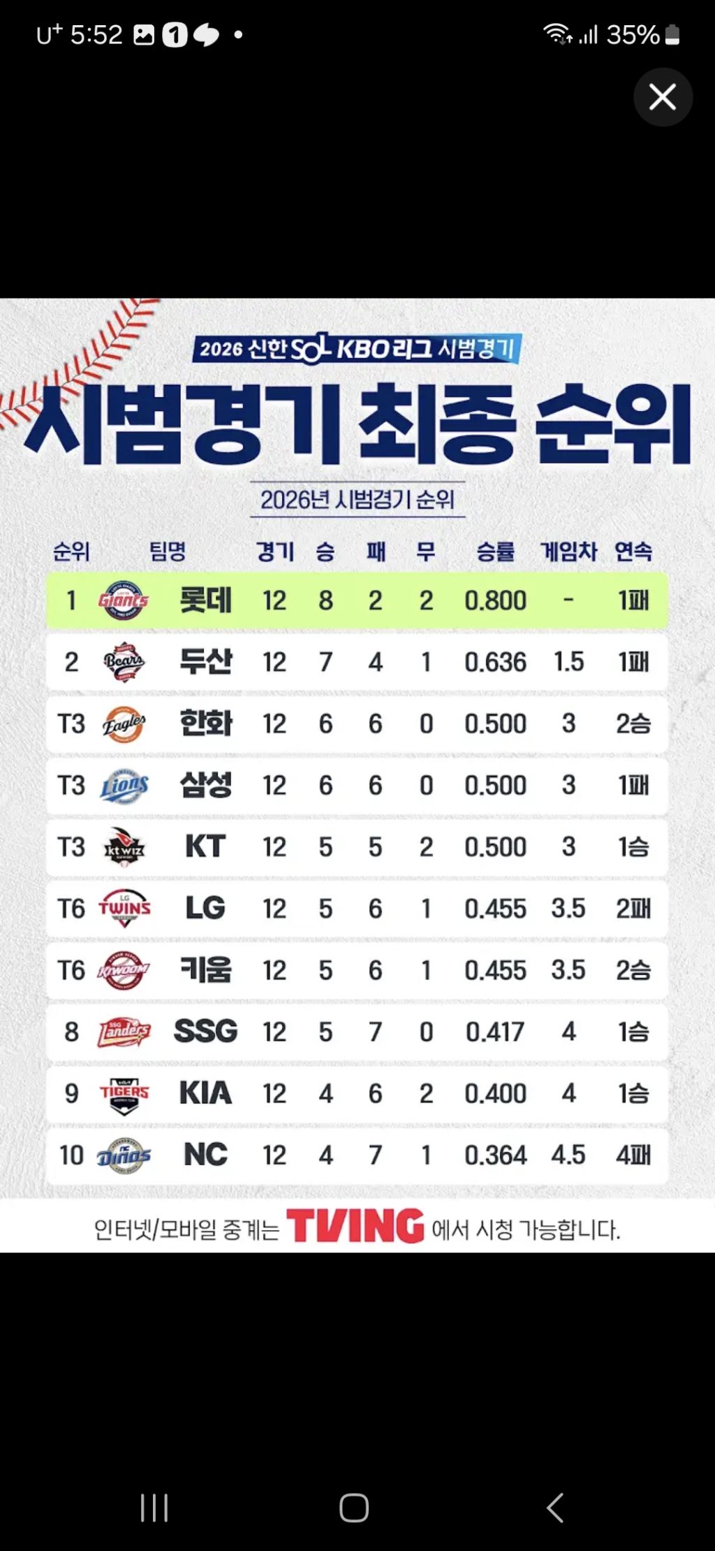 [KT]시범경기 최종순위 작성자gkqwndrnr|작성시간26.03.24|조회수262 목록 댓글 3 글자크기 작게가 글자크기 크게가 이대로 시즌 끝냄 타이브레이커를 몇번해야하냐.ㅋㅋㅋ 다음검색 현재 게시글 추가 기능 열기 북마크 공유하기 신고 센터로 신고 댓글 댓글 3 댓글쓰기 답글쓰기 댓글 리스트 작성자내꿈은롯데우승보ㄱI | 작성시간 26.03.24 new 5할 균형의 수호자 작성자개초딩 | 작성시간 26.03.24 new 킹데 작성자아이사 | 작성시간 26.03.24 new 범호갓동님 ㅜㅜ 댓글 전체보기