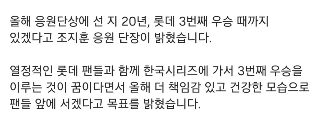 갓데 조지훈 응원 단장님 롯데 3번째 우승 때까지 남아있겠다. 작성자우엉우어엉|작성시간26.03.28|조회수152 목록 댓글 4 글자크기 작게가 글자크기 크게가 다음검색 현재 게시글 추가 기능 열기 북마크 공유하기 신고 센터로 신고 댓글 댓글 4 댓글쓰기 답글쓰기 댓글 리스트 작성자자오두이 | 작성시간 26.03.28 new 종신선언 ㄷㄷ 작성자닐니리 | 작성시간 26.03.28 new 우승해도 가시면 안되는데 ㄷㄷ 작성자니바스 | 작성시간 26.03.28 new 이렇게 종신선언하시다니 작성자술못먹는사람 | 작성시간 26.03.28 new 쪼단 종신선언 댓글 전체보기