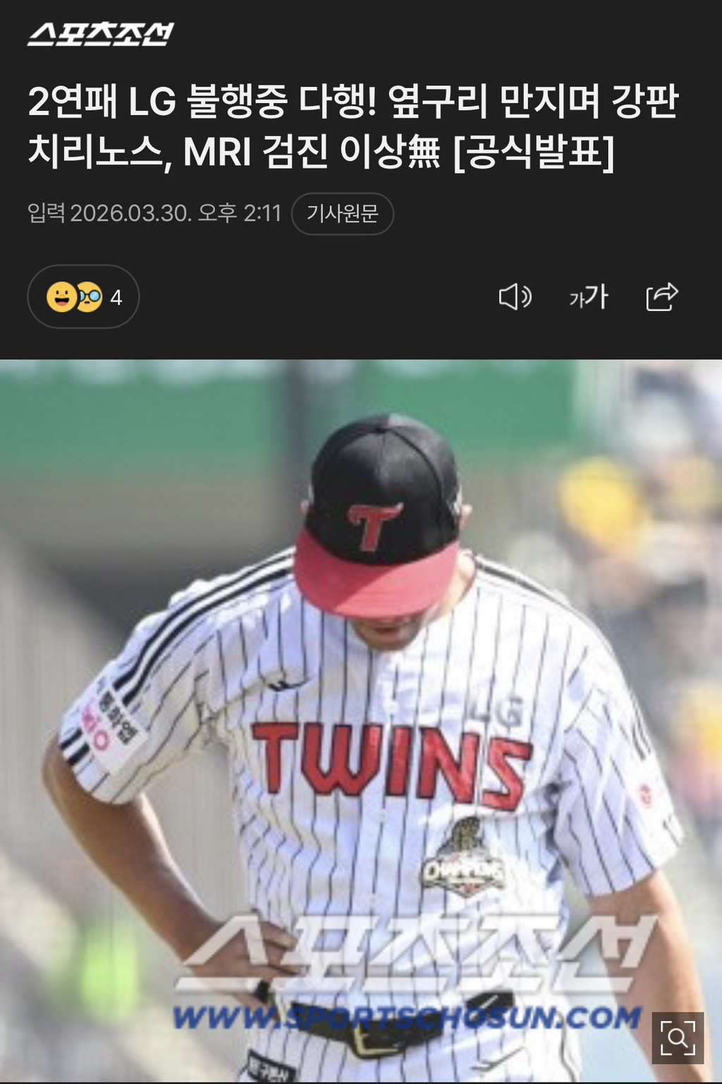 [LG]옆구리 만지며 강판 치리노스, MRI 검진 이상無 [공식발표] 작성자PSG[War]|작성시간26.03.30|조회수291 목록 댓글 6 글자크기 작게가 글자크기 크게가 https://naver.me/xfbhnOo82연패 LG 불행중 다행! 옆구리 만지며 강판 치리노스, MRI 검진 이상無 [공식발표]여기를 눌러 링크를 확인하세요m.sports.naver.com그나마 다행 ㅠ 다음검색 현재 게시글 추가 기능 열기 북마크 공유하기 신고 센터로 신고 댓글 댓글 6 댓글쓰기 답글쓰기 댓글 리스트 작성자TWINS | 작성시간 26.03.30 그럼 새끼야 그냥 잃었단 말이냐 그 큰 점수를 답댓글 작성자변 검 | 작성시간 26.03.30 ㅋㅋㅋㅋㅋㅋ 작성자카틀레치 | 작성시간 26.03.30 야 그러면..흠.. 작성자타루 | 작성시간 26.03.30 그러면 그냥 실력으로 쳐맞은거였단 말이냐ㅠㅠ 작성자관람하는관람차 | 작성시간 26.03.30 그냥 맞았음 청년 댓글 전체보기