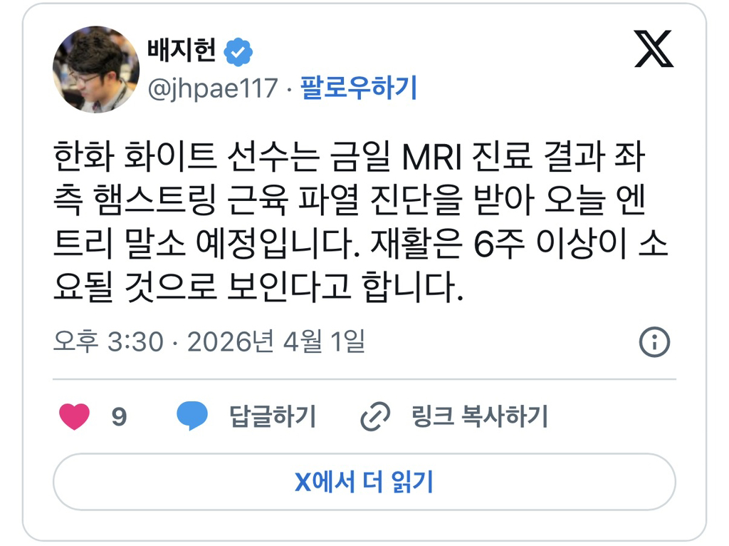 [한화]화이트 햄스트링 파열 6주+ 작성자왕대가리정우주|작성시간26.04.01|조회수256 목록 댓글 3 글자크기 작게가 글자크기 크게가 아 다음검색 현재 게시글 추가 기능 열기 북마크 공유하기 신고 센터로 신고 댓글 댓글 3 댓글쓰기 답글쓰기 댓글 리스트 작성자행복했으면좋겠다 | 작성시간 26.04.01 한화이글스 샷따 내립니다 작성자RoMg VeGetable | 작성시간 26.04.01 아이고 조졌네 ㅠ 무리하지말지 작성자변 검 | 작성시간 26.04.01 망했어요~~~~ 댓글 전체보기