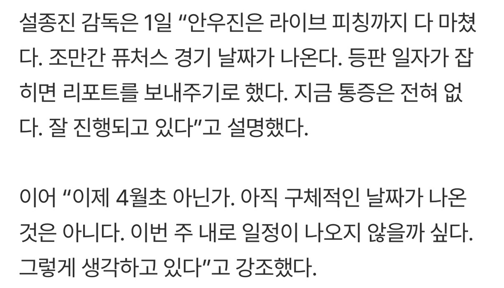 안우진 복귀 임박 작성자Stellive|작성시간26.04.02|조회수360 목록 댓글 5 글자크기 작게가 글자크기 크게가 ‘마침내!’ 키움 슈퍼 에이스, 퓨처스 실전 ‘임박’…예정보다 ‘빨리’ 돌아온다 [SS시선집중여기를 눌러 링크를 확인하세요m.sports.naver.com키움제외 9개구단 비ㅣㅣㅣㅣㅣㅣ상 다음검색 현재 게시글 추가 기능 열기 북마크 공유하기 신고 센터로 신고 댓글 댓글 5 댓글쓰기 답글쓰기 댓글 리스트 작성자여자친구는버디 | 작성시간 26.04.02 new 와씨 기대된다 작성자니바스 | 작성시간 26.04.02 new 빨리 해냐되나? 큰부상인데 천천히 몸만들고 안전하게 복귀해야지 작성자정은원 | 작성시간 26.04.02 new 킹이즈백... 작성자꽃 길 | 작성시간 26.04.02 new 안우진 잘하면 ㄹㅇ 롯데 꼴지 각 나오는데 작성자루크쇼우 | 작성시간 26.04.02 new 메쟈행1순위 댓글 전체보기