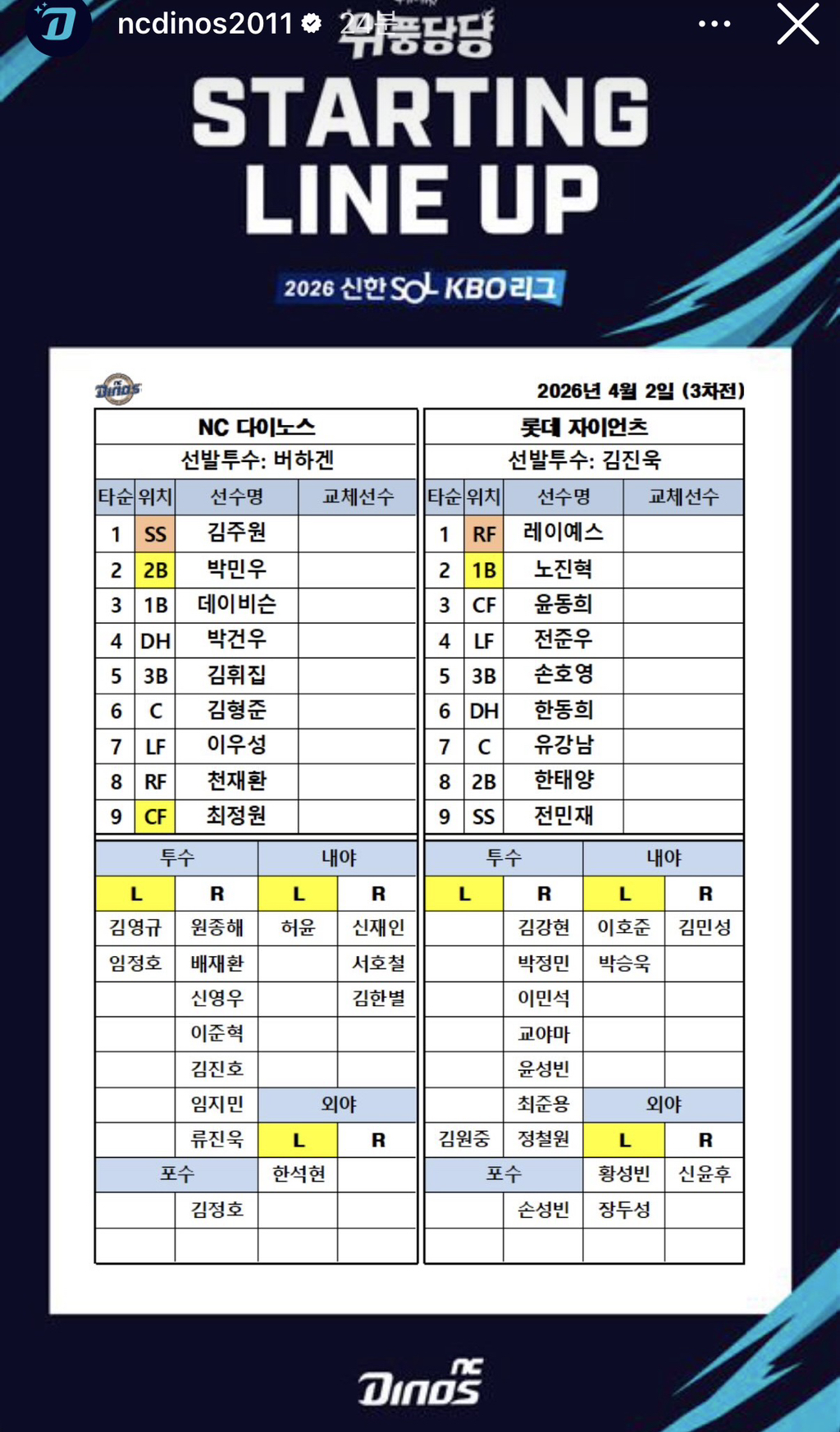 [NC]NC vs 롯데 라인업 작성자Stellive|작성시간26.04.02|조회수91 목록 댓글 2 글자크기 작게가 글자크기 크게가 다음검색 현재 게시글 추가 기능 열기 북마크 공유하기 신고 센터로 신고 댓글 댓글 2 댓글쓰기 답글쓰기 댓글 리스트 작성자아스콩 | 작성시간 26.04.02 new 롯데 좌투 다죽었노.... 작성자내꿈은롯데우승보ㄱI | 작성시간 26.04.02 new 시발 좌투가 없네 ㅋㅋㅋㅋㅋㅋㅋㅋㅋ 댓글 전체보기