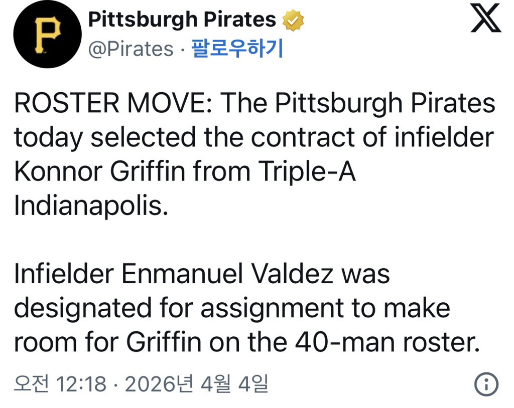 [해외야구][오피셜] 피츠버그 파이리츠, 코너 그리핀 콜업 작성자Stellive|작성시간26.04.04|조회수333 목록 댓글 2 글자크기 작게가 글자크기 크게가 등번호는 6번1998년 5월 26일 아라미스 라미레즈 이후피츠버그 파이리츠에서 데뷔하는 첫 10대 선수 다음검색 현재 게시글 추가 기능 열기 북마크 공유하기 신고 센터로 신고 댓글 댓글 2 댓글쓰기 답글쓰기 댓글 리스트 작성자니바스 | 작성시간 26.04.04 new 샌터 그리핀은 없나요 답댓글 작성자혼고아이 | 작성시간 26.04.04 new 포워드 그리핀은 있어요 댓글 전체보기