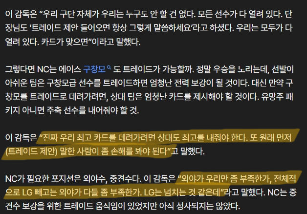 대놓고 외야수 원한다 + 빅딜 원한다 + 먼저 원하는 팀이 손해를 봐야 된다 이럴 정도면 NC는 진짜 핵심선수 제시했나봄