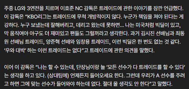 우리나라 정서상 빅네임 트레이드가 쉽게 나오진않을거같음 ㅋㅋㅋㅋ -