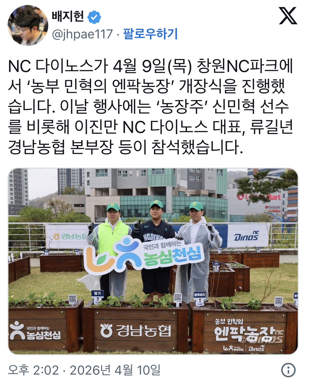 [NC]NC 다이노스가 4월 9일(목) 창원NC파크에서 ‘농부 민혁의 엔팍농장’ 개장식을 진행했습니다. 작성자Stellive|작성시간26.04.10|조회수137 목록 댓글 2 글자크기 작게가 글자크기 크게가 다음검색 현재 게시글 추가 기능 열기 북마크 공유하기 신고 센터로 신고 댓글 댓글 2 댓글쓰기 답글쓰기 댓글 리스트 작성자Las〃 | 작성시간 26.04.10 new 농민혁 ㄷㄷ 작성자타루 | 작성시간 26.04.10 new 당신은 야구선수잖아요! 댓글 전체보기