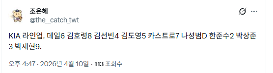 [KIA]ㄹㅇㅇ 작성자동워니92|작성시간26.04.10|조회수92 목록 댓글 3 글자크기 작게가 글자크기 크게가 1 데일 유격수2 김호령 중견수3 김선빈 2루수4 김도영 3루수5 카스트로 좌익수6 나성범 지명타자7 한준수 포수8 박상준 1루수9 박재현 우익수P 네일 선발투수 다음검색 현재 게시글 추가 기능 열기 북마크 공유하기 신고 센터로 신고 댓글 댓글 3 댓글쓰기 답글쓰기 댓글 리스트 작성자루크쇼우 | 작성시간 26.04.10 new 복붙이군 수비만바뀌고 작성자10월8일 | 작성시간 26.04.10 new 그래도 지타 계속 바꾸면서 휴식주는건 좋은듯 작성자세상이말년 | 작성시간 26.04.10 new 음 네일이 나왔으니 불펜이 또 방화하겠구나 댓글 전체보기