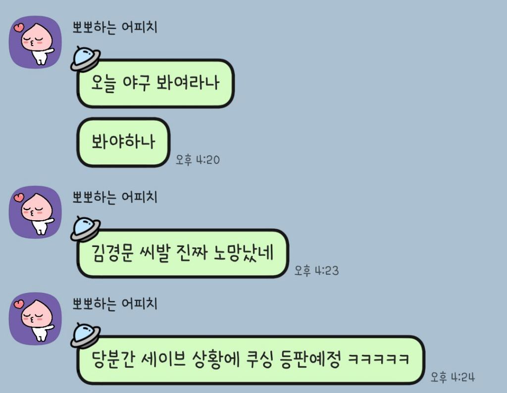 [KIA]화가 많이 난 한화 팬 친구.. 작성자설알문2|작성시간26.04.15|조회수433 목록 댓글 1 글자크기 작게가 글자크기 크게가 다음검색 현재 게시글 추가 기능 열기 북마크 공유하기 신고 센터로 신고 댓글 댓글 1 댓글쓰기 답글쓰기 댓글 리스트 작성자행복했으면좋겠다 | 작성시간 26.04.15 new 한화팬을 제일 잘 긁는건 분탕도 아니고 김경문이다 댓글 전체보기