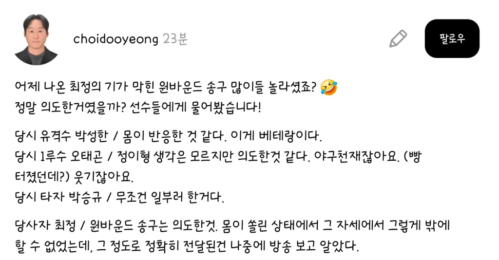 [SSG]최정: 바운드 송구는 의도한거다 작성자Stellive|작성시간26.04.23|조회수222 목록 댓글 2 글자크기 작게가 글자크기 크게가 3루 수비는 역시 ㄷㄷㄷ 다음검색 현재 게시글 추가 기능 열기 북마크 공유하기 신고 센터로 신고 댓글 댓글 2 댓글쓰기 답글쓰기 댓글 리스트 작성자행복했으면좋겠다 | 작성시간 26.04.23 야천 작성자그렇구나 | 작성시간 26.04.23 오늘 홈런 쳐줘요 댓글 전체보기