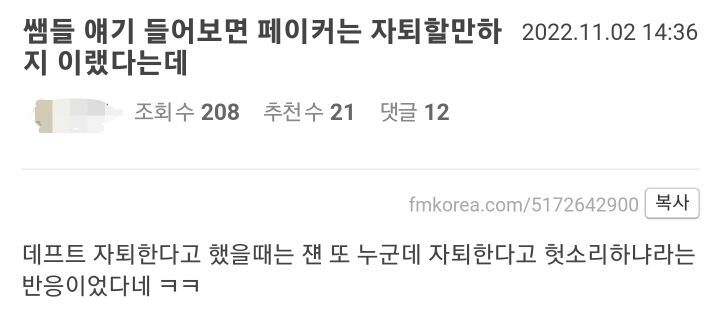 답댓글 작성시간 22.11.02 제가 보기엔 걍 구라같음 페이커 데프트 데뷔시기가 비슷한데 페이커가 더 유명했더라도 저정도 반응까지 나올 수준은 절대 아님