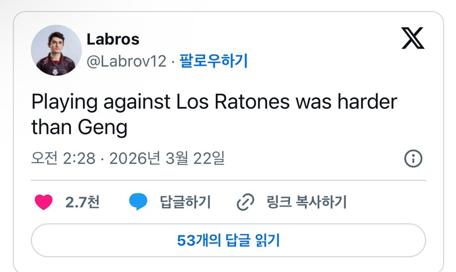 라브로프 트윗 ㅋㅋㅋㅋㅋ 작성자느리다.|작성시간26.03.22|조회수1,469 목록 댓글 1 글자크기 작게가 글자크기 크게가 팩트라 할 말이 없네 ㅋㅋㅋㅋ 다음검색 현재 게시글 추가 기능 열기 북마크 공유하기 신고 센터로 신고 댓글 댓글 1 댓글쓰기 답글쓰기 댓글 리스트 작성자구래구래구래팸 | 작성시간 26.03.22 G2 다잘하지만 스큐몬드랑 얘가 진짜 존나 잘함 ㅋㅋㅋㅋ 댓글 전체보기