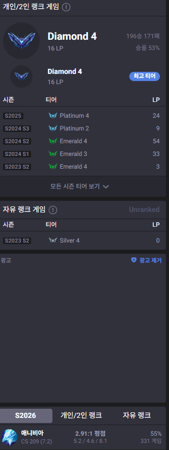 애니비아 원챔.. 자꾸 에메1에서 10연패씩 박았는데.. 드디어 입성... ㅠㅠ