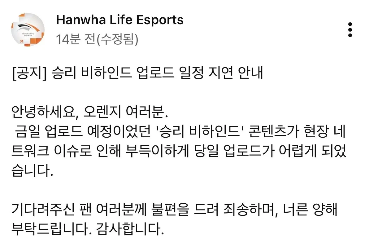 한화생명 유튜브 사과문 게시 작성자원딜위주로해|작성시간26.04.01|조회수827 목록 댓글 2 글자크기 작게가 글자크기 크게가 오늘 경기 비하인드 영상 당일에 업로드 못해서 사과 다음검색 현재 게시글 추가 기능 열기 북마크 공유하기 신고 센터로 신고 댓글 댓글 2 댓글쓰기 답글쓰기 댓글 리스트 작성자스키테일러s | 작성시간 26.04.01 거짓말 마!! 만우절이라고 늦게주는거잖아! 작성자Bruno Mars | 작성시간 26.04.01 노피디 만우절이라고 거짓말하고싶었나보네ㅋㅋㅋ 댓글 전체보기