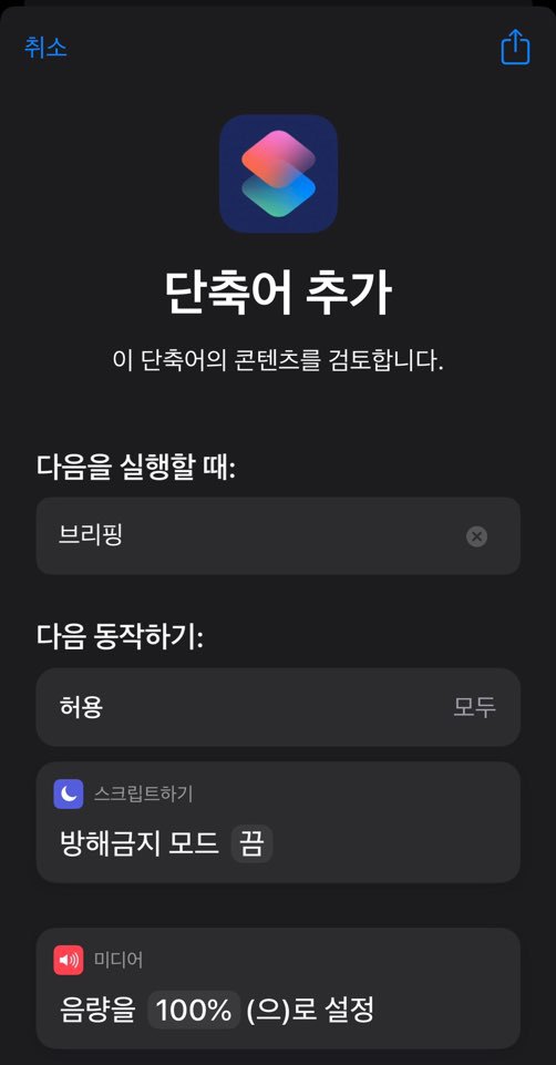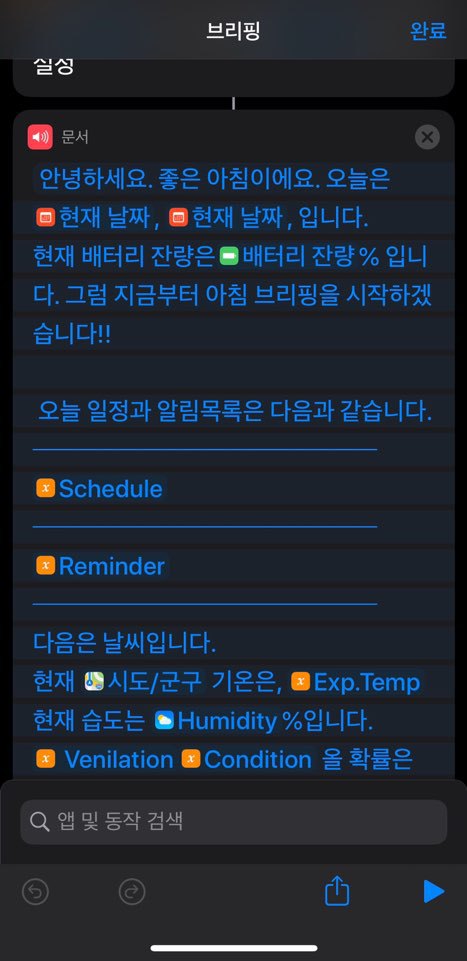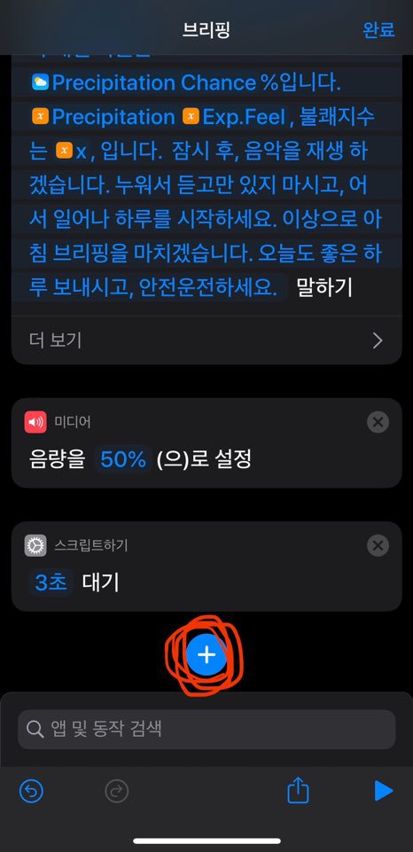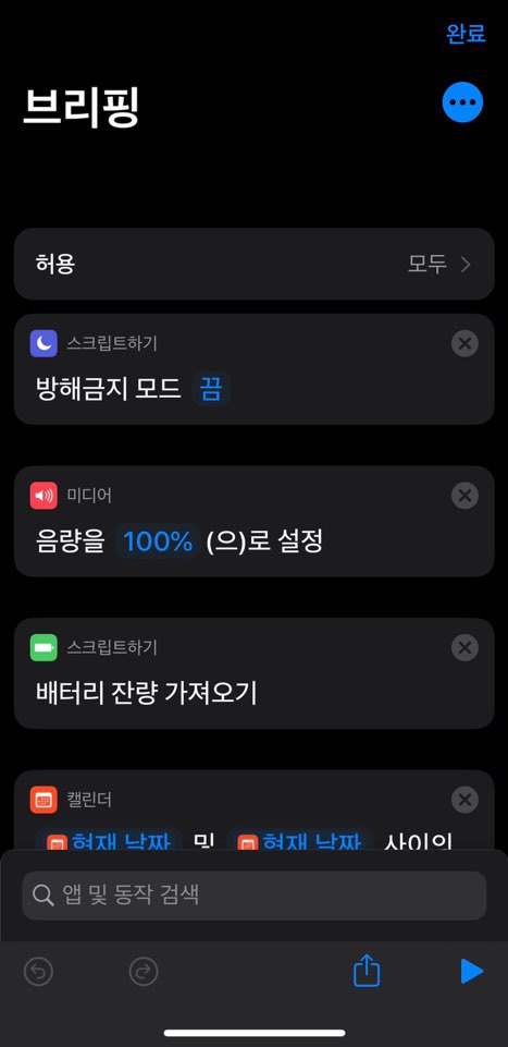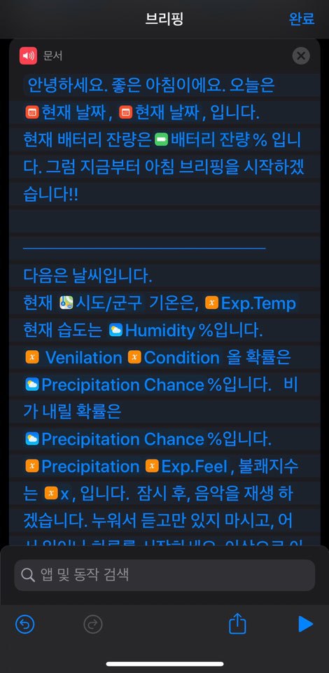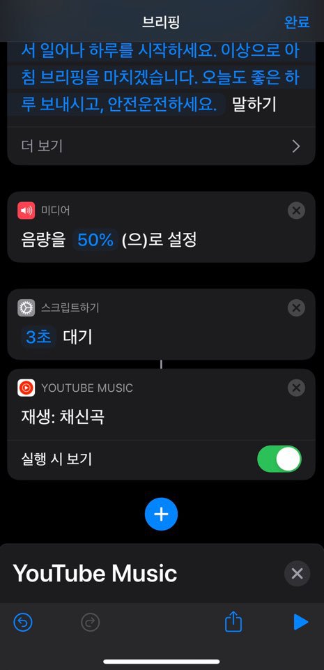 현재 날짜, 배터리 잔량, 오늘 일정, 알림목록, 현재 위치 날씨, 기온 등을 브리핑 해준 후 유튜브 뮤직을 자동으로 틀어주는 단축어입니다.