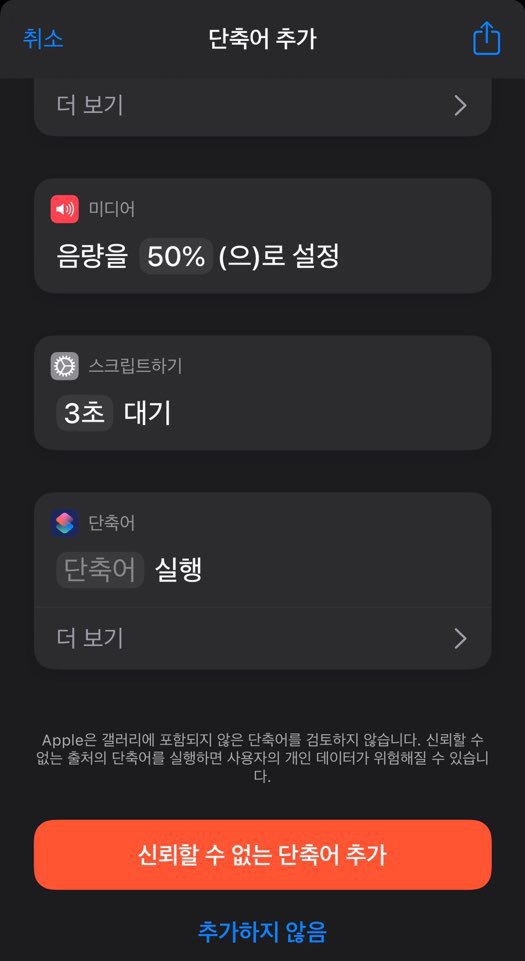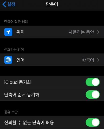 먼저 설정-단축어-신뢰할 수 없는 단축어 허용을 활성화 시켜줍시다