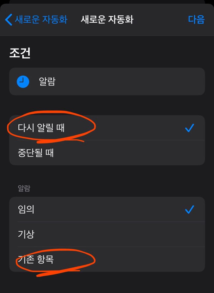 다시 알릴 때 : 알람이 울렸을때 아이폰의 물리버튼(전원버튼, 음량 높낮이버튼)을 누르시는분들은 다시 알릴때를 선택해주세요.